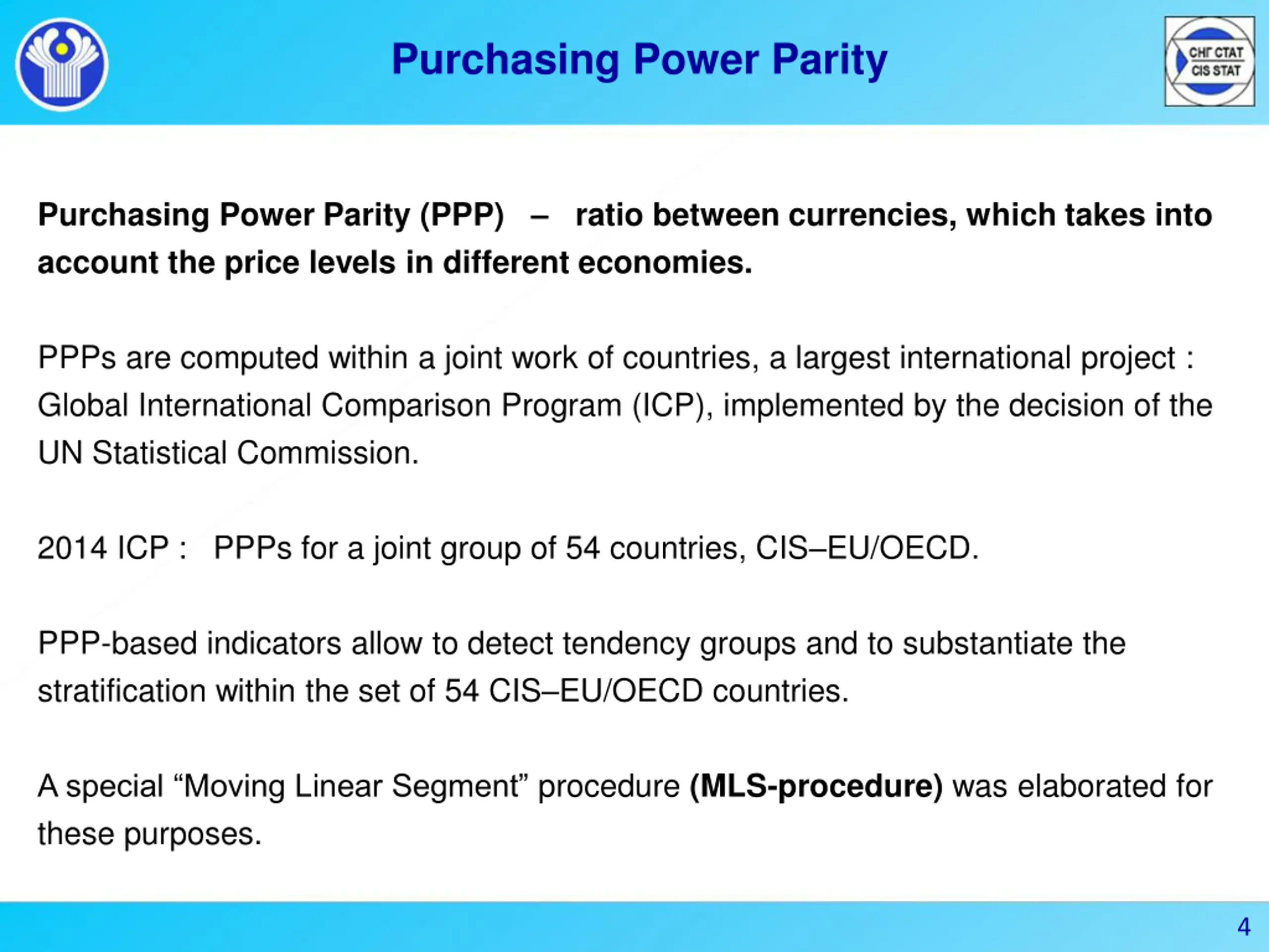 Purchasing Power Parity Purchasing Power Parity (PPP) ratio between currencies, which takes into account the price levels in different economies. PPPs are computed within a joint work of countries, a largest international project : Global International Comparison Program (ICP), implemented by the decision of the UN Statistical Commission. 2014 ICP : PPPs for a joint group of 54 countries, CIS EU/OECD. PPP-based indicators allow to detect tendency groups and to substantiate the stratification within the set of 54 CIS EU/OECD countries. A special Moving Linear Segment procedure (MLS-procedure) was elaborated for these purposes. 4