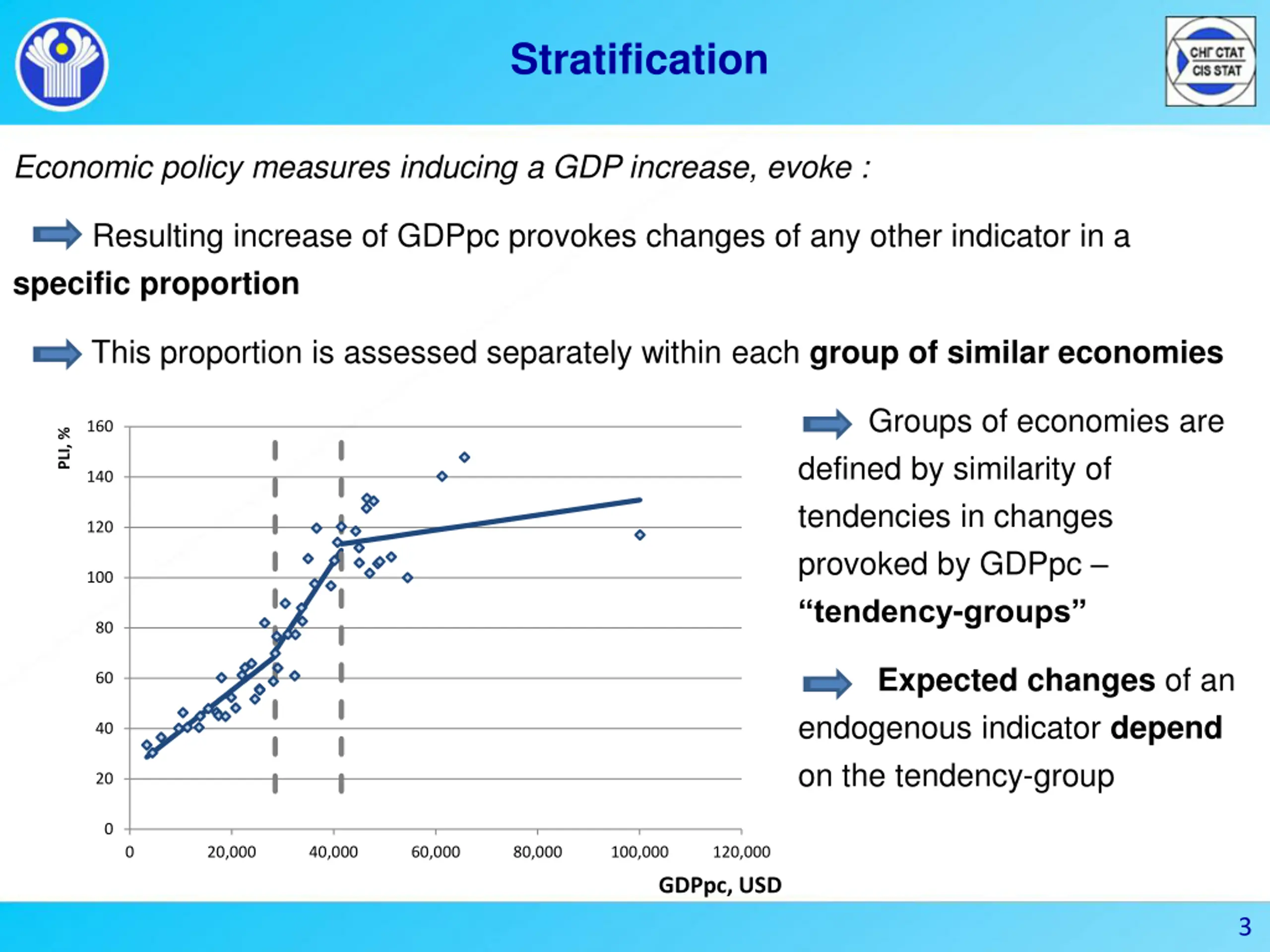 Stratification Economic policy measures inducing a GDP increase, evoke : Resulting increase of GDPpc provokes changes of any other indicator in a specific proportion This proportion is assessed separately within each group of similar economies Groups of economies are defined by similarity of tendencies in changes provoked by GDPpc tendency-groups 160 PLI, % 140 120 100 80 Expected changes of an endogenous indicator depend on the tendency-group 60 40 20 0 0 20,000 40,000 60,000 80,000 100,000 120,000 GDPpc, USD 3