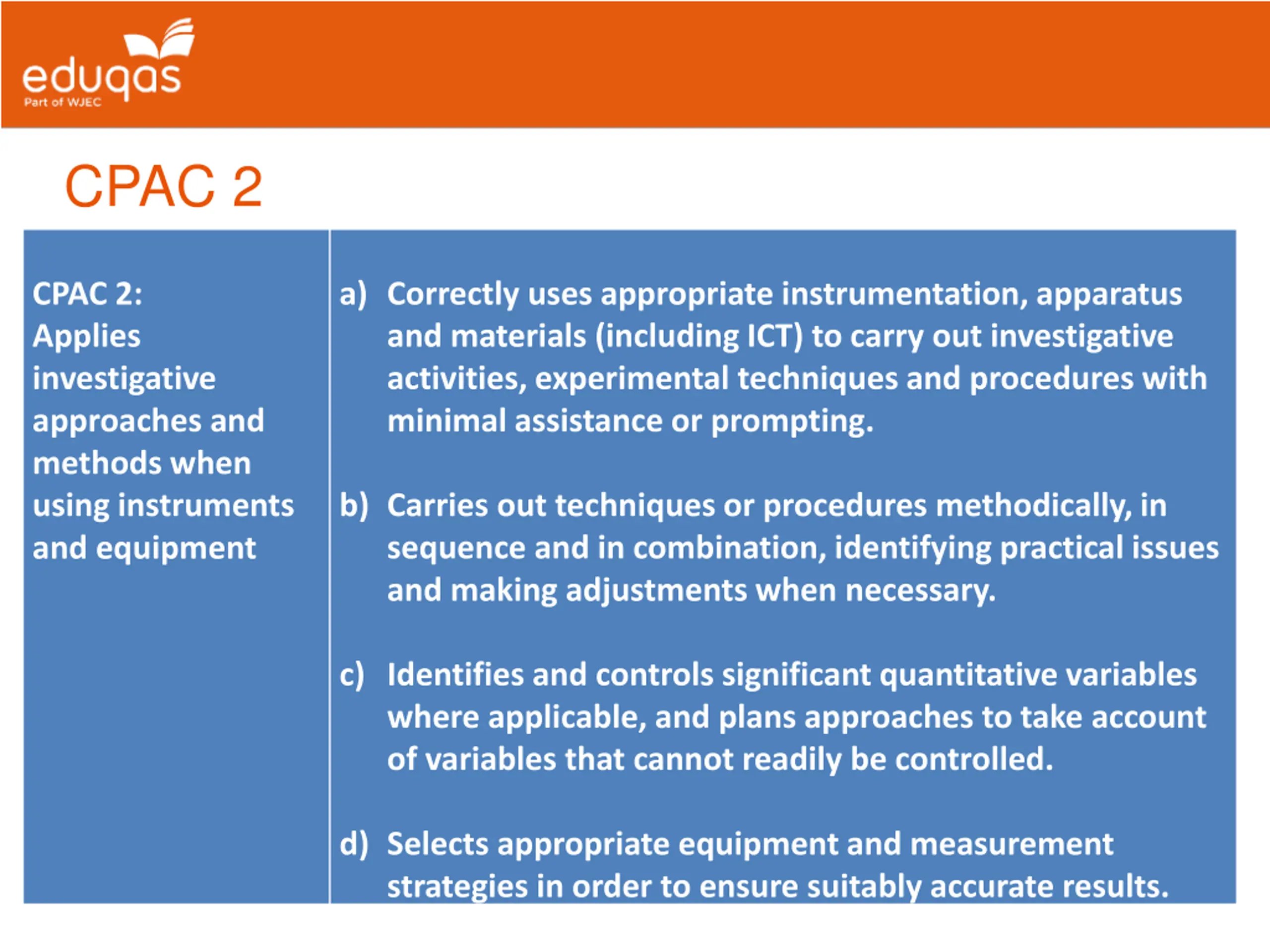 CPAC 2 CPAC 2: Applies investigative approaches and methods when using instruments and equipment a) Correctly uses appropriate instrumentation, apparatus and materials (including ICT) to carry out investigative activities, experimental techniques and procedures with minimal assistance or prompting. b) Carries out techniques or procedures methodically, in sequence and in combination, identifying practical issues and making adjustments when necessary. c) Identifies and controls significant quantitative variables where applicable, and plans approaches to take account of variables that cannot readily be controlled. d) Selects appropriate equipment and measurement strategies in order to ensure suitably accurate results.