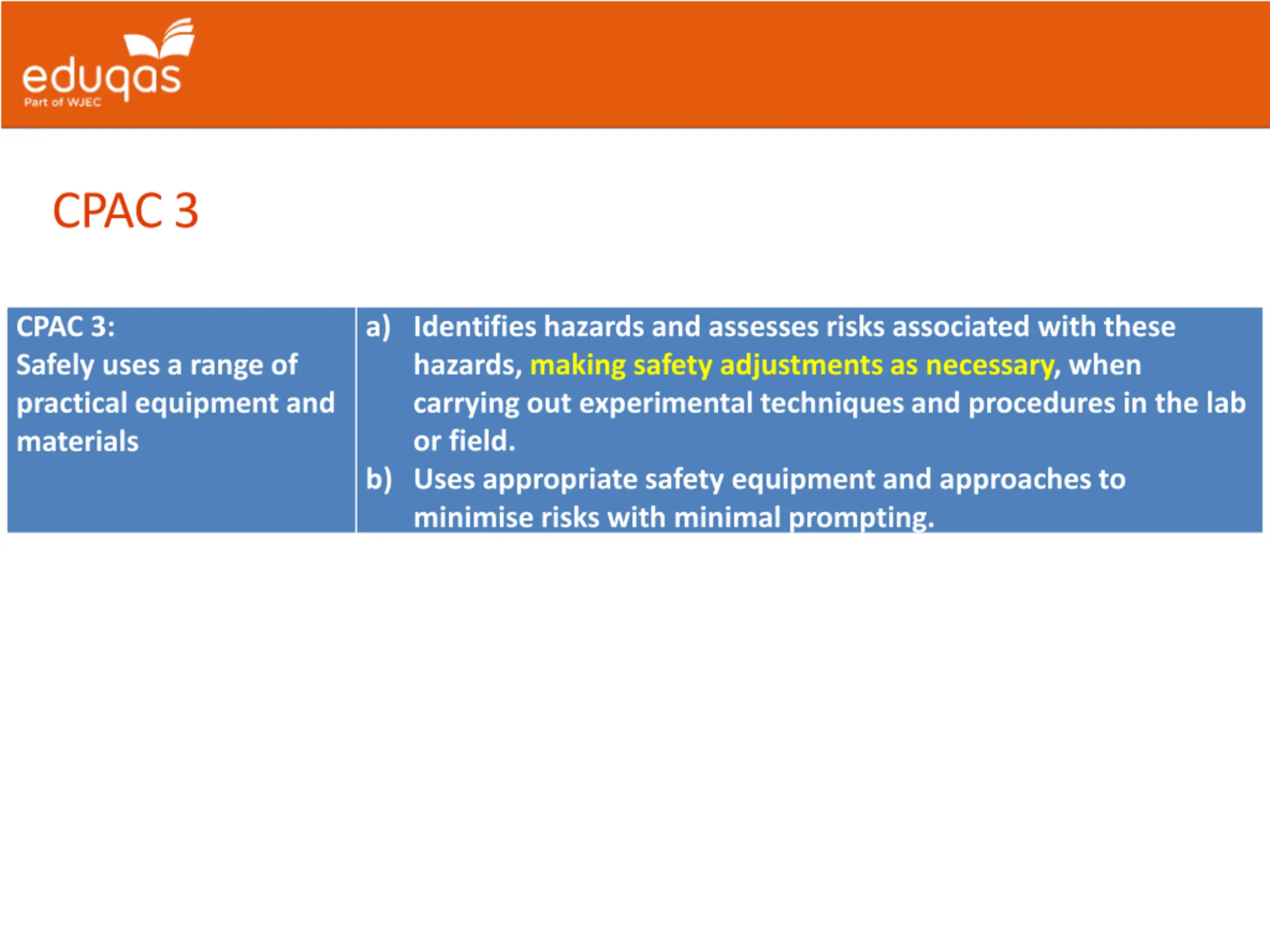 CPAC 3 CPAC 3: Safely uses a range of practical equipment and materials a) Identifies hazards and assesses risks associated with these hazards, making safety adjustments as necessary, when carrying out experimental techniques and procedures in the lab or field. b) Uses appropriate safety equipment and approaches to minimise risks with minimal prompting.
