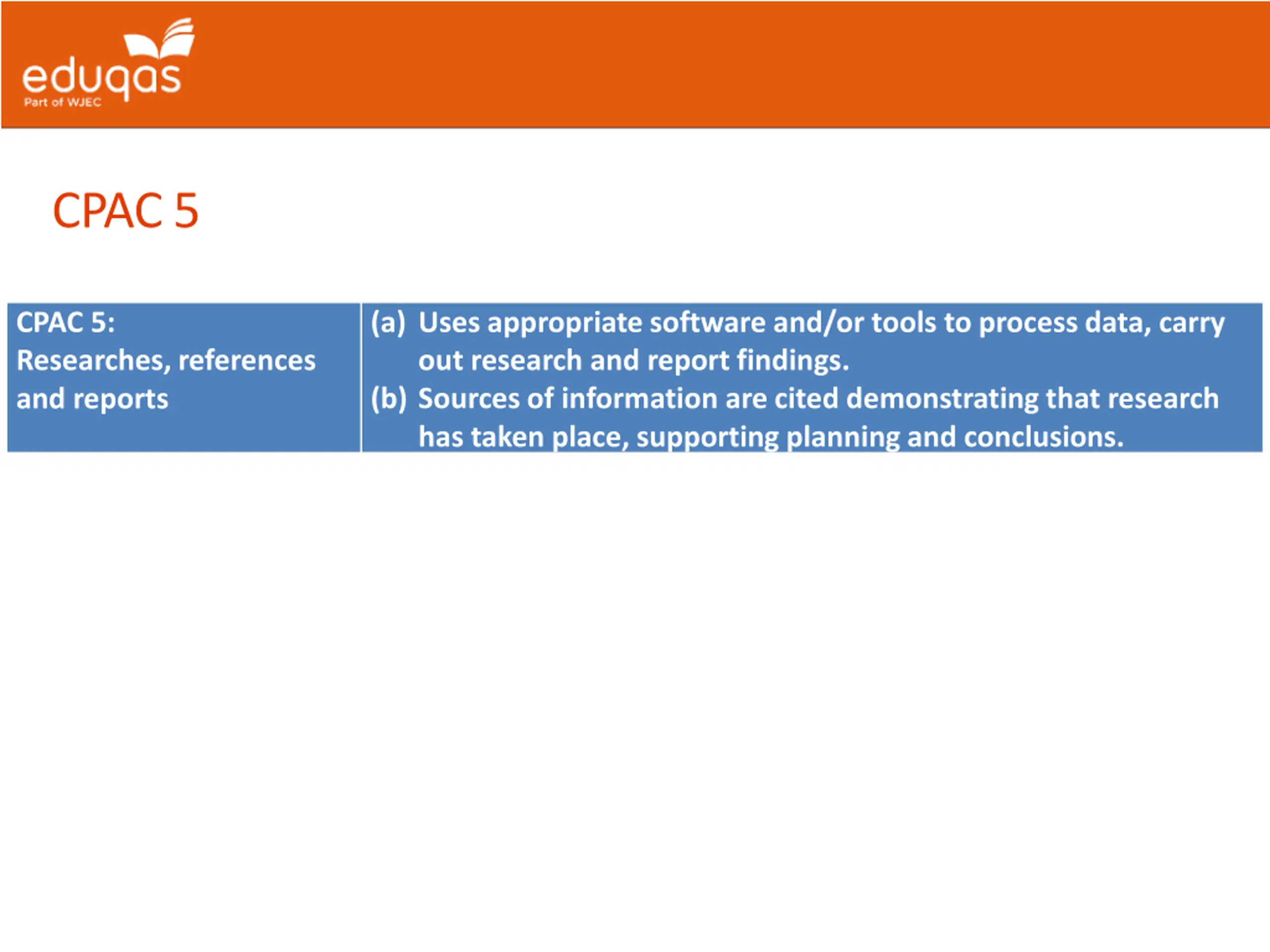 CPAC 5 CPAC 5: Researches, references and reports (a) Uses appropriate software and/or tools to process data, carry out research and report findings. (b) Sources of information are cited demonstrating that research has taken place, supporting planning and conclusions.