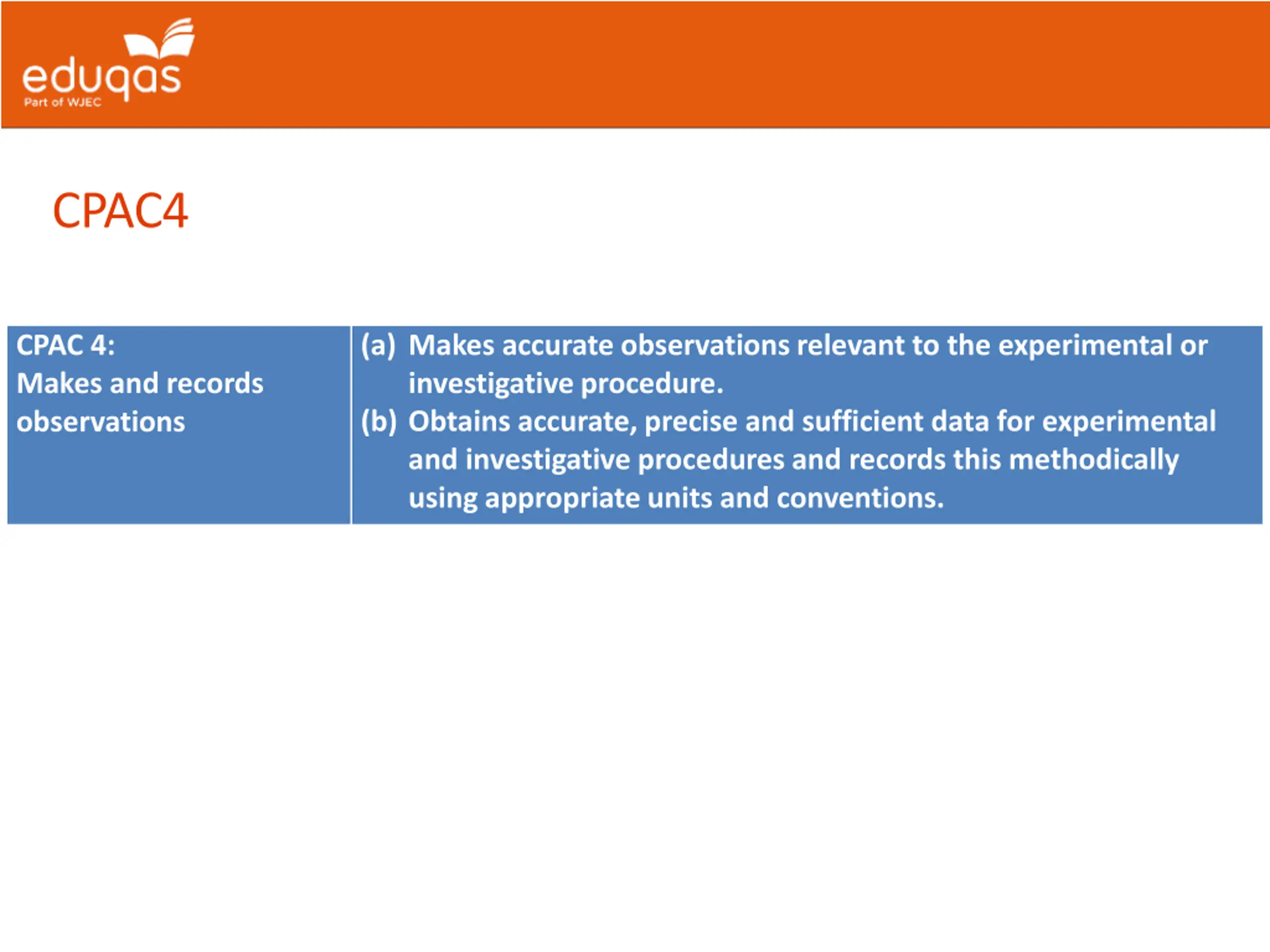 CPAC4 CPAC 4: Makes and records observations (a) Makes accurate observations relevant to the experimental or investigative procedure. (b) Obtains accurate, precise and sufficient data for experimental and investigative procedures and records this methodically using appropriate units and conventions.