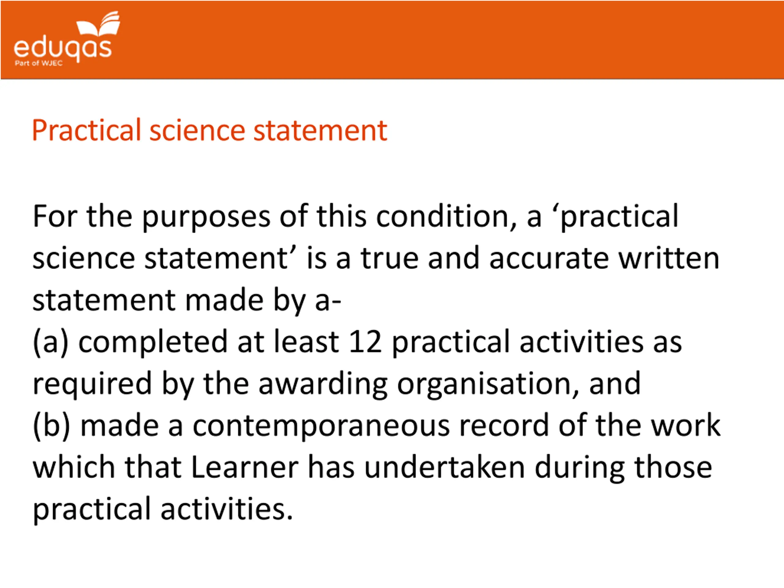 Practical science statement For the purposes of this condition, a practical science statement is a true and accurate written statement made by a- (a) completed at least 12 practical activities as required by the awarding organisation, and (b) made a contemporaneous record of the work which that Learner has undertaken during those practical activities.