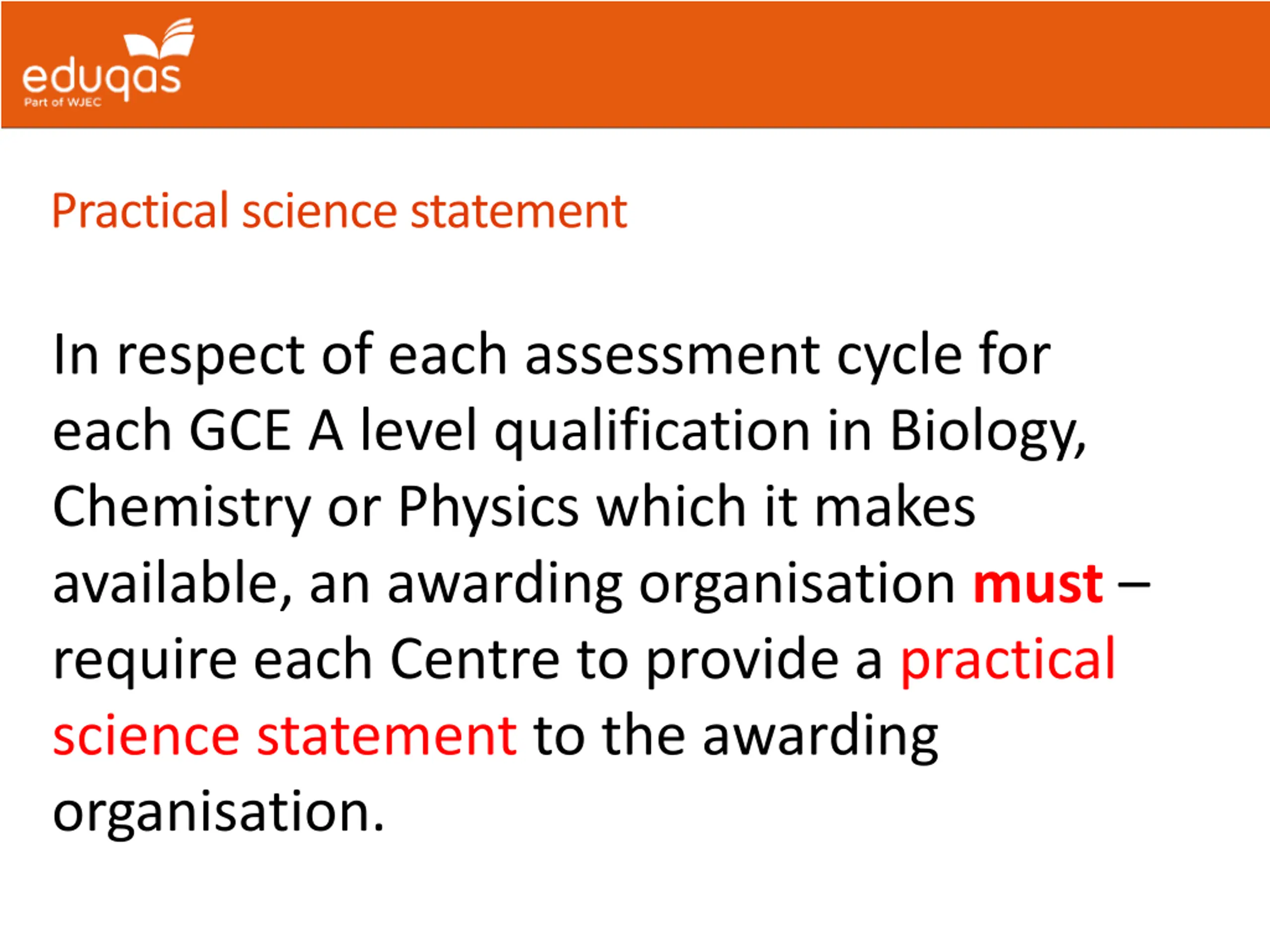 Practical science statement In respect of each assessment cycle for each GCE A level qualification in Biology, Chemistry or Physics which it makes available, an awarding organisation must require each Centre to provide a practical science statement to the awarding organisation.