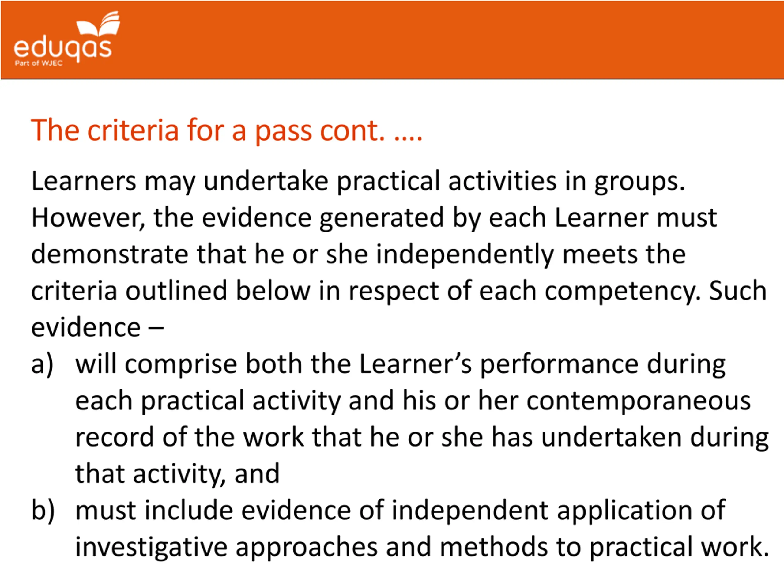 The criteria for a pass cont. . Learners may undertake practical activities in groups. However, the evidence generated by each Learner must demonstrate that he or she independently meets the criteria outlined below in respect of each competency. Such evidence a) will comprise both the Learner s performance during each practical activity and his or her contemporaneous record of the work that he or she has undertaken during that activity, and b) must include evidence of independent application of investigative approaches and methods to practical work.