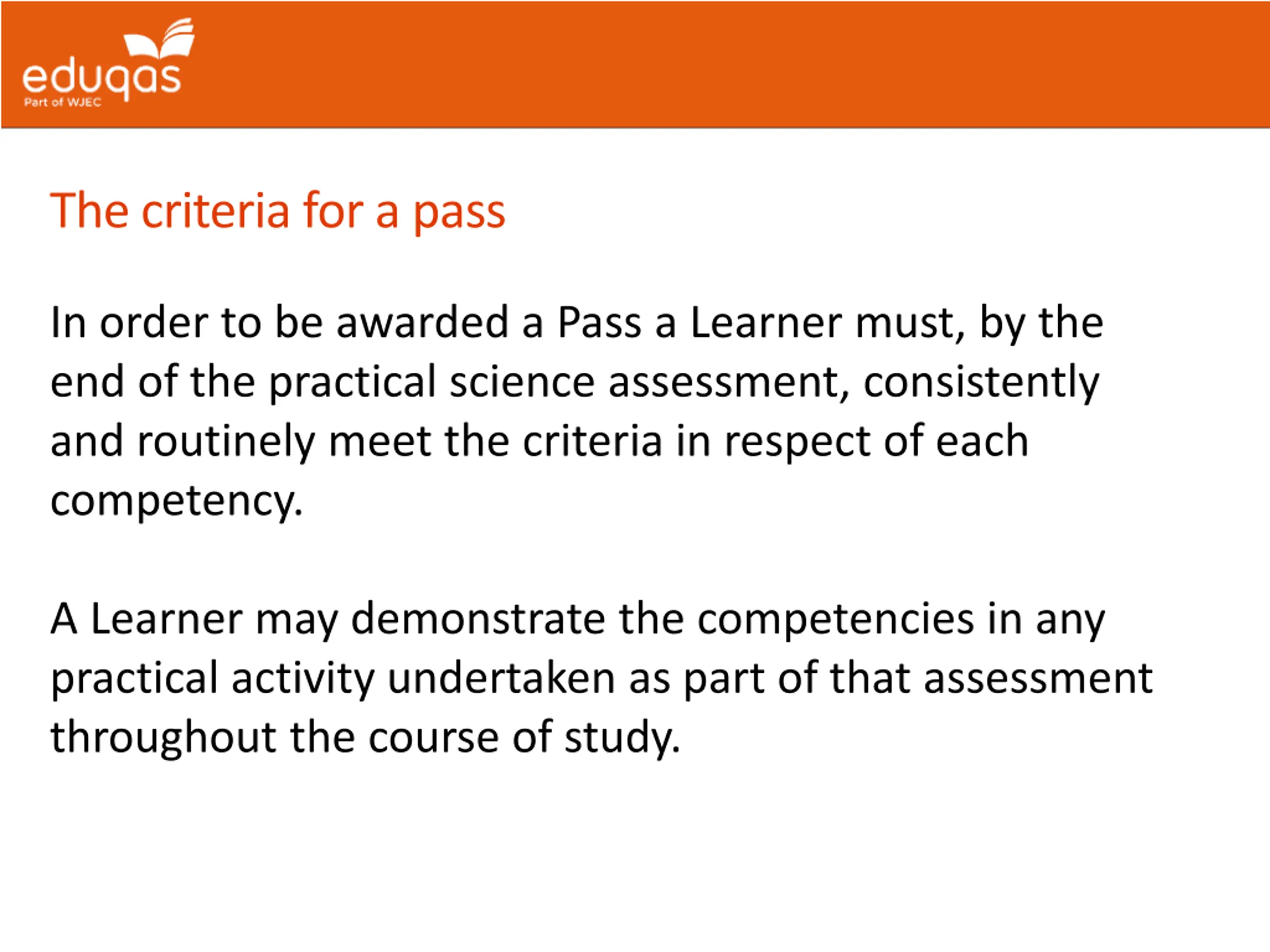The criteria for a pass In order to be awarded a Pass a Learner must, by the end of the practical science assessment, consistently and routinely meet the criteria in respect of each competency. A Learner may demonstrate the competencies in any practical activity undertaken as part of that assessment throughout the course of study.