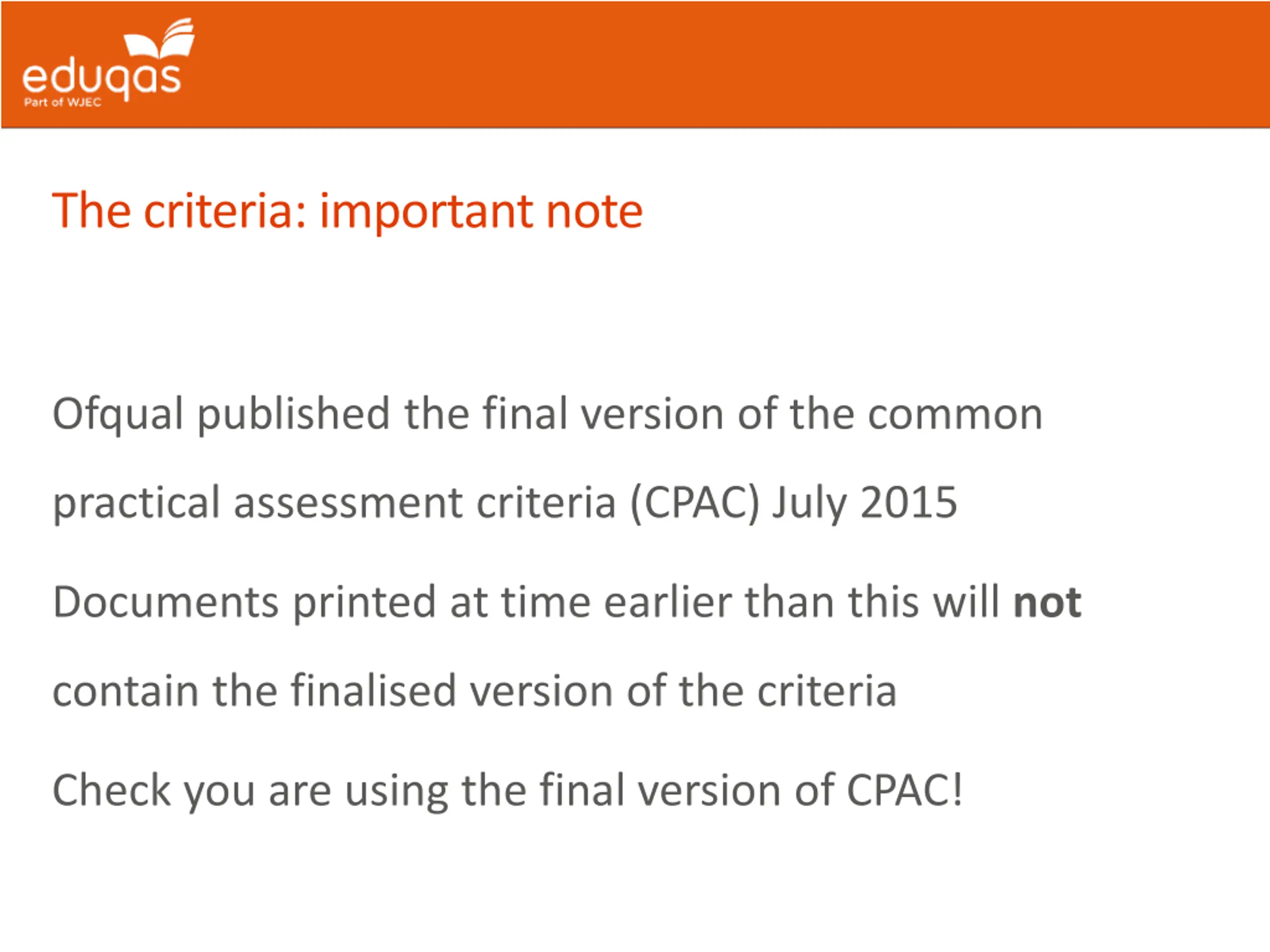 The criteria: important note Ofqual published the final version of the common practical assessment criteria (CPAC) July 2015 Documents printed at time earlier than this will not contain the finalised version of the criteria Check you are using the final version of CPAC!