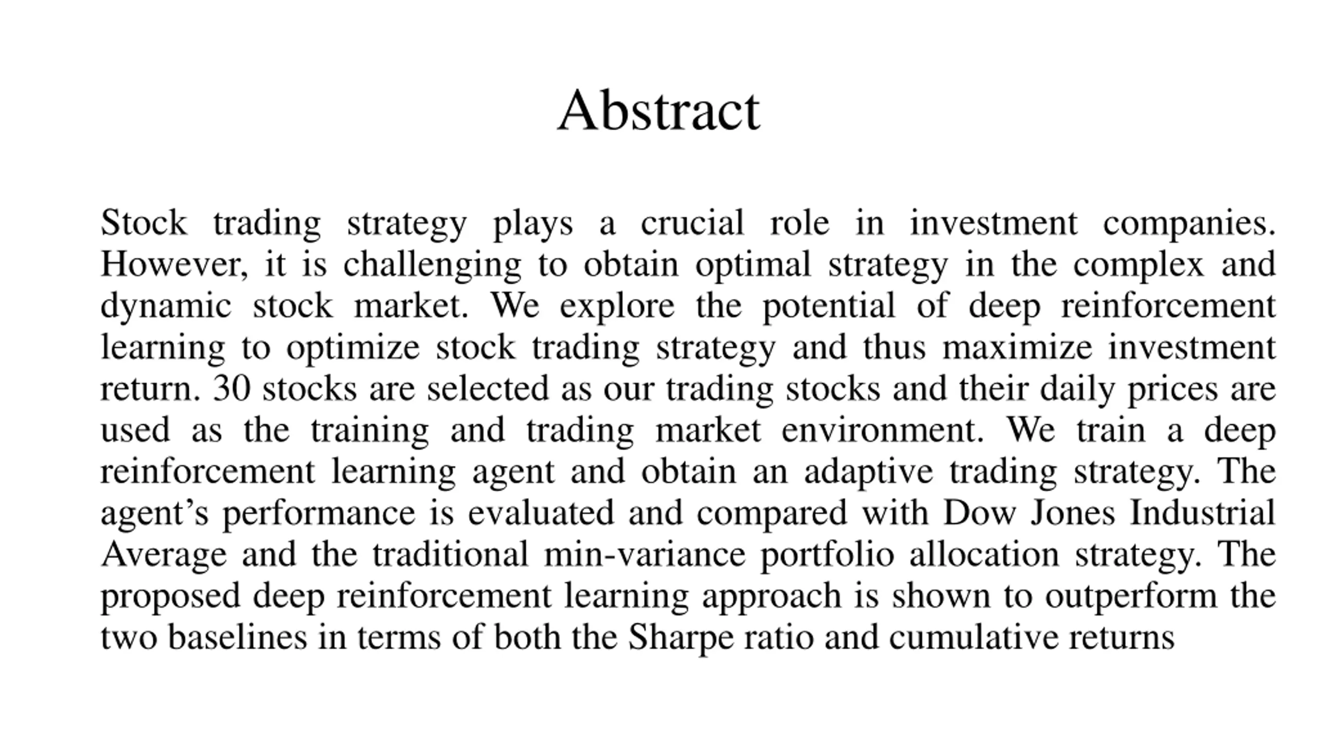 Explore the potential of deep reinforcement learning to optimize stock trading strategies and maximize investment returns. This study evaluates the performance of a deep reinforcement learning agent in comparison to traditional strategies using 30 selected stocks. Results demonstrate outperformance in terms of Sharpe ratio and cumulative returns.