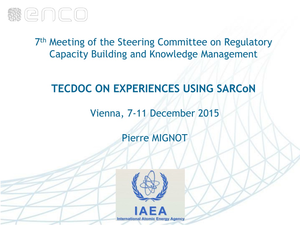 7thMeeting of the Steering Committee on Regulatory Capacity Building and Knowledge Management TECDOC ON EXPERIENCES USING SARCoN Vienna, 7-11 December 2015 Pierre MIGNOT