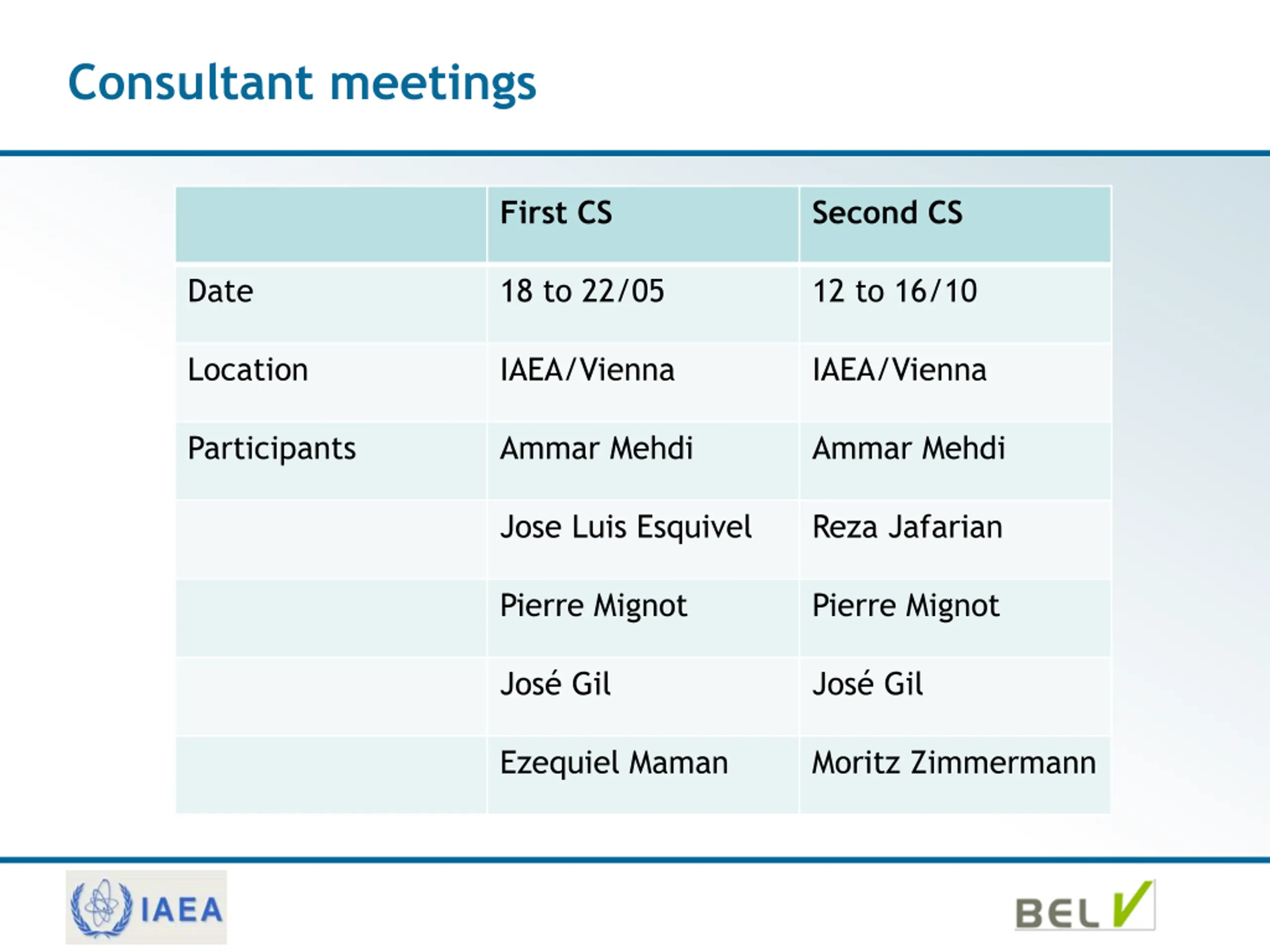 Consultant meetings First CS Second CS Date 18 to 22/05 12 to 16/10 Location IAEA/Vienna IAEA/Vienna Participants Ammar Mehdi Ammar Mehdi Jose Luis Esquivel Reza Jafarian Pierre Mignot Pierre Mignot Jos Gil Jos Gil Ezequiel Maman Moritz Zimmermann