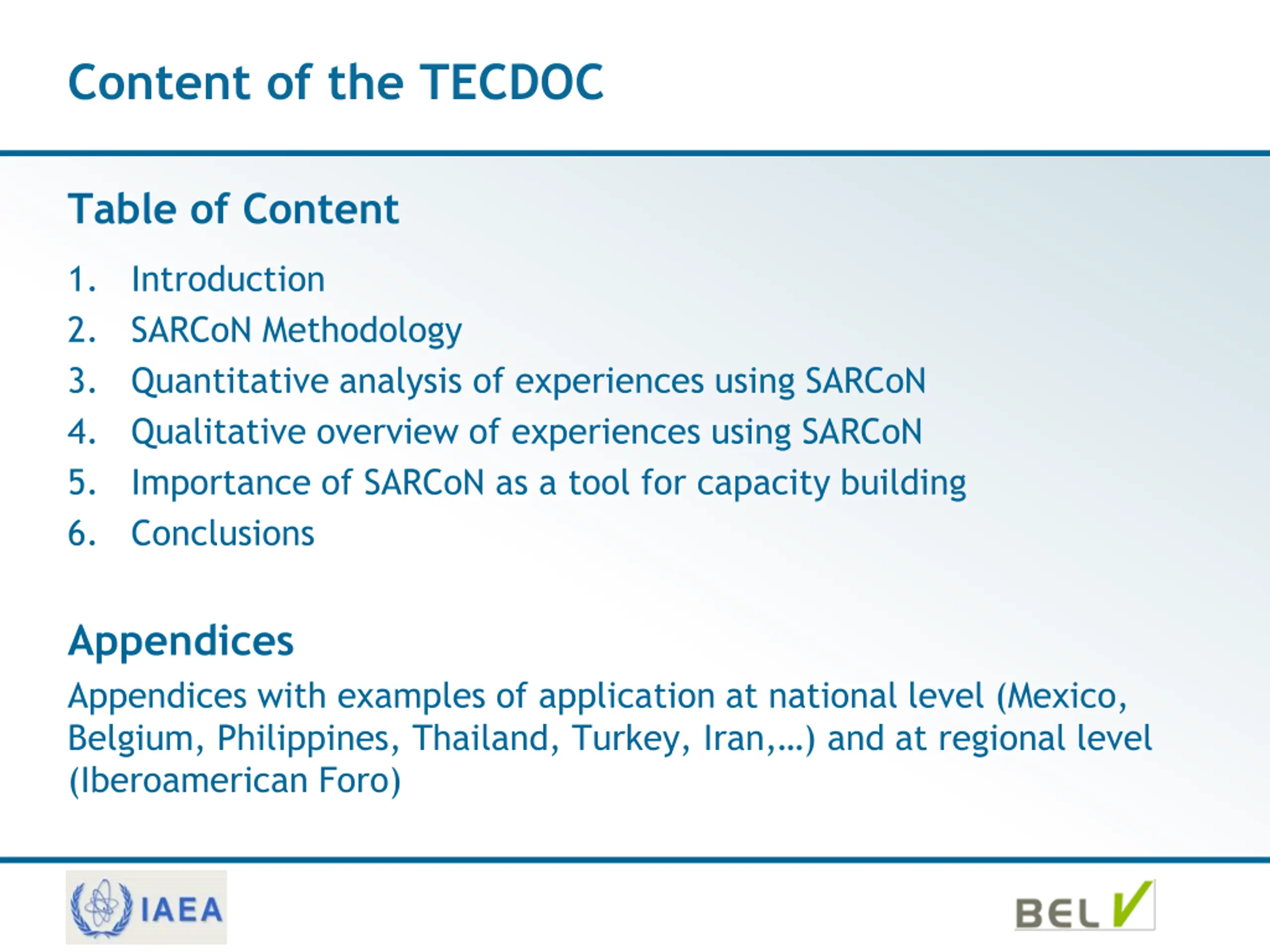 Content of the TECDOC Table of Content 1. 2. 3. 4. 5. 6. Introduction SARCoN Methodology Quantitative analysis of experiences using SARCoN Qualitative overview of experiences using SARCoN Importance of SARCoN as a tool for capacity building Conclusions Appendices Appendices with examples of application at national level (Mexico, Belgium, Philippines, Thailand, Turkey, Iran, ) and at regional level (Iberoamerican Foro)