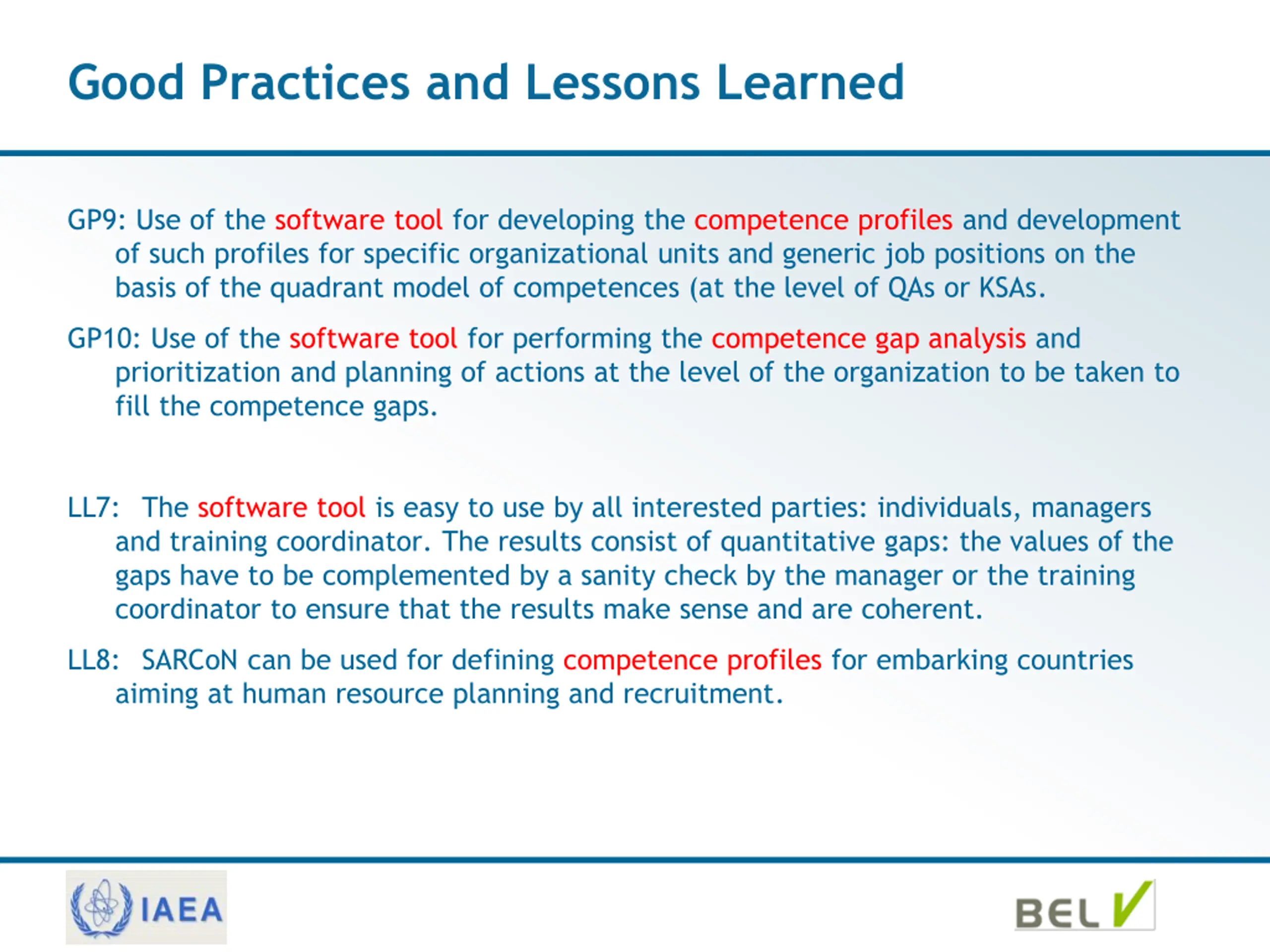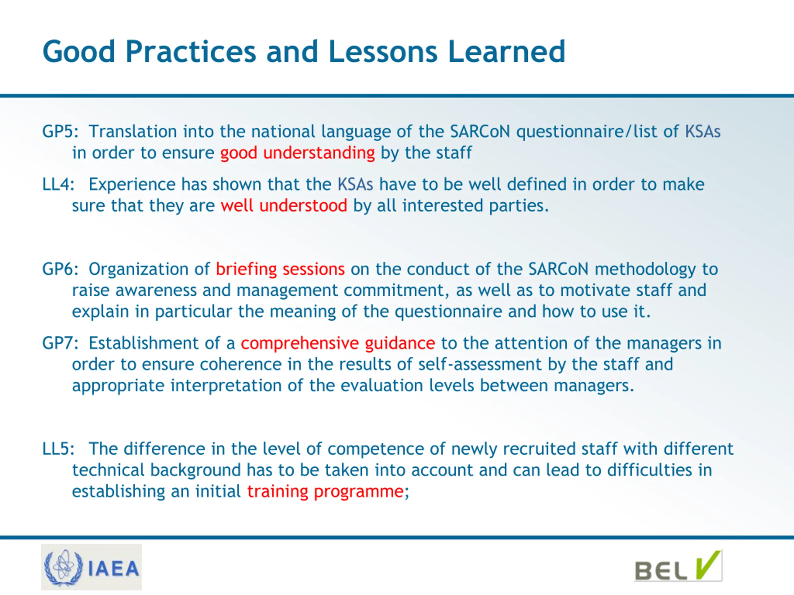 Good Practices and Lessons Learned GP5: Translation into the national language of the SARCoN questionnaire/list of KSAs in order to ensure good understanding by the staff LL4: Experience has shown that the KSAs have to be well defined in order to make sure that they are well understood by all interested parties. GP6: Organization of briefing sessions on the conduct of the SARCoN methodology to raise awareness and management commitment, as well as to motivate staff and explain in particular the meaning of the questionnaire and how to use it. GP7: Establishment of a comprehensive guidance to the attention of the managers in order to ensure coherence in the results of self-assessment by the staff and appropriate interpretation of the evaluation levels between managers. LL5: The difference in the level of competence of newly recruited staff with different technical background has to be taken into account and can lead to difficulties in establishing an initial training programme;