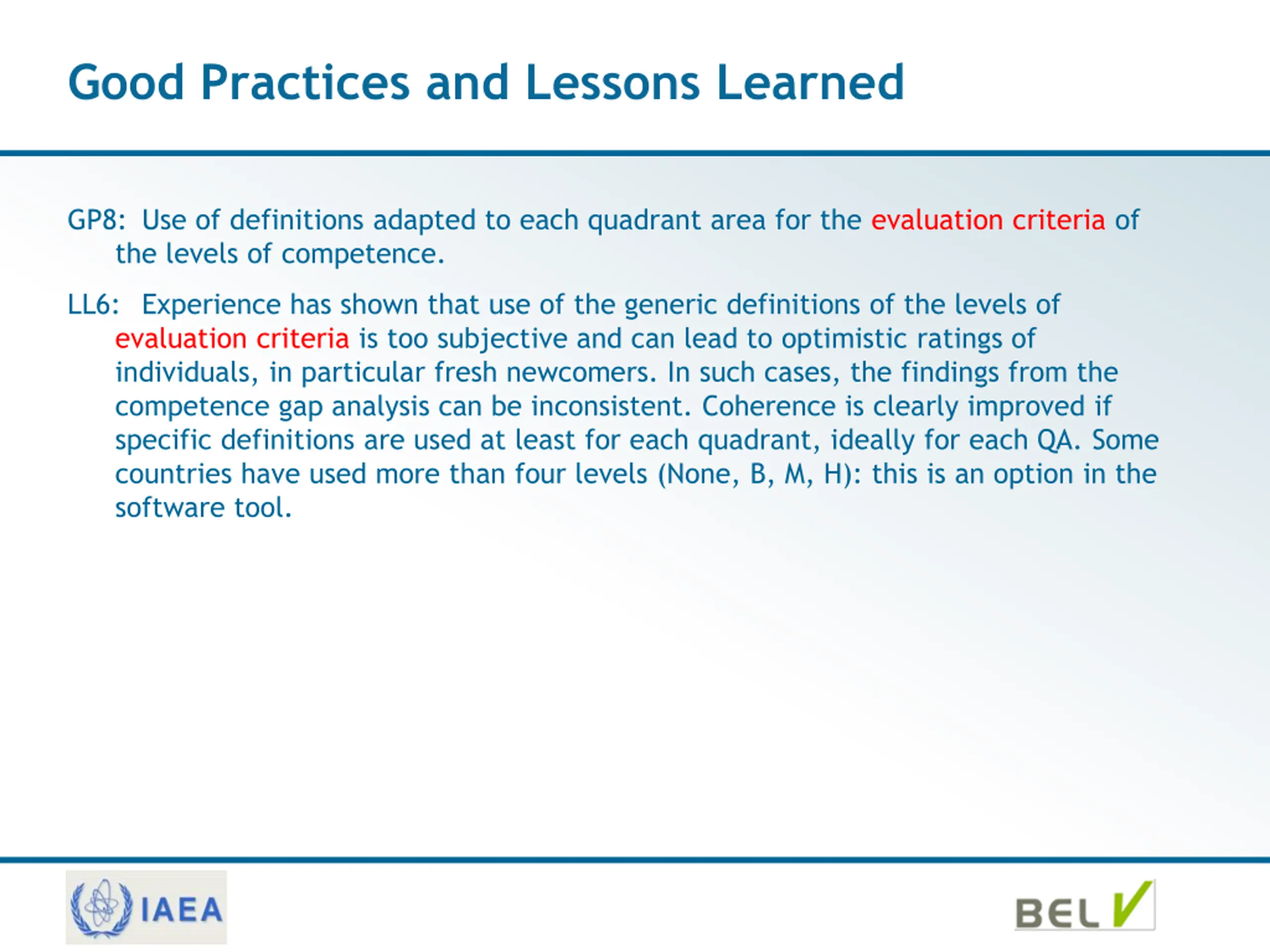 Good Practices and Lessons Learned GP8: Use of definitions adapted to each quadrant area for the evaluation criteria of the levels of competence. LL6: Experience has shown that use of the generic definitions of the levels of evaluation criteria is too subjective and can lead to optimistic ratings of individuals, in particular fresh newcomers. In such cases, the findings from the competence gap analysis can be inconsistent. Coherence is clearly improved if specific definitions are used at least for each quadrant, ideally for each QA. Some countries have used more than four levels (None, B, M, H): this is an option in the software tool.