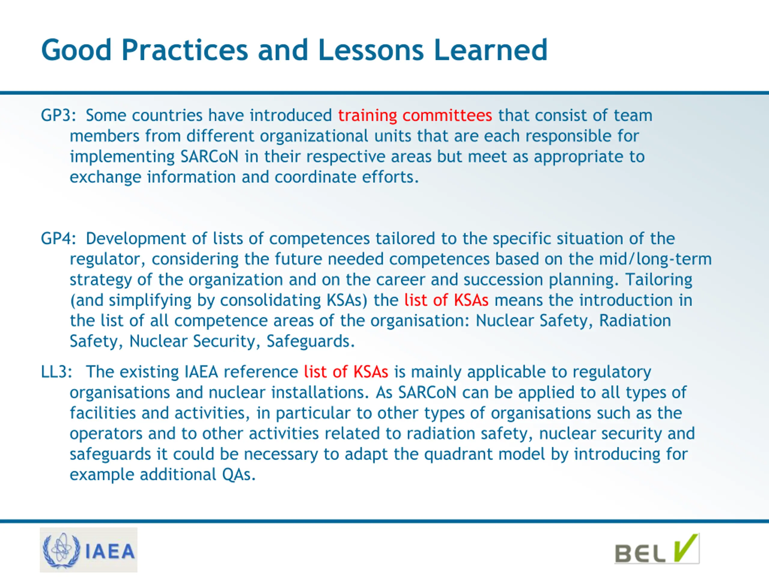 Good Practices and Lessons Learned GP3: Some countries have introduced training committees that consist of team members from different organizational units that are each responsible for implementing SARCoN in their respective areas but meet as appropriate to exchange information and coordinate efforts. GP4: Development of lists of competences tailored to the specific situation of the regulator, considering the future needed competences based on the mid/long-term strategy of the organization and on the career and succession planning. Tailoring (and simplifying by consolidating KSAs) the list of KSAs means the introduction in the list of all competence areas of the organisation: Nuclear Safety, Radiation Safety, Nuclear Security, Safeguards. LL3: The existing IAEA reference list of KSAs is mainly applicable to regulatory organisations and nuclear installations. As SARCoN can be applied to all types of facilities and activities, in particular to other types of organisations such as the operators and to other activities related to radiation safety, nuclear security and safeguards it could be necessary to adapt the quadrant model by introducing for example additional QAs.