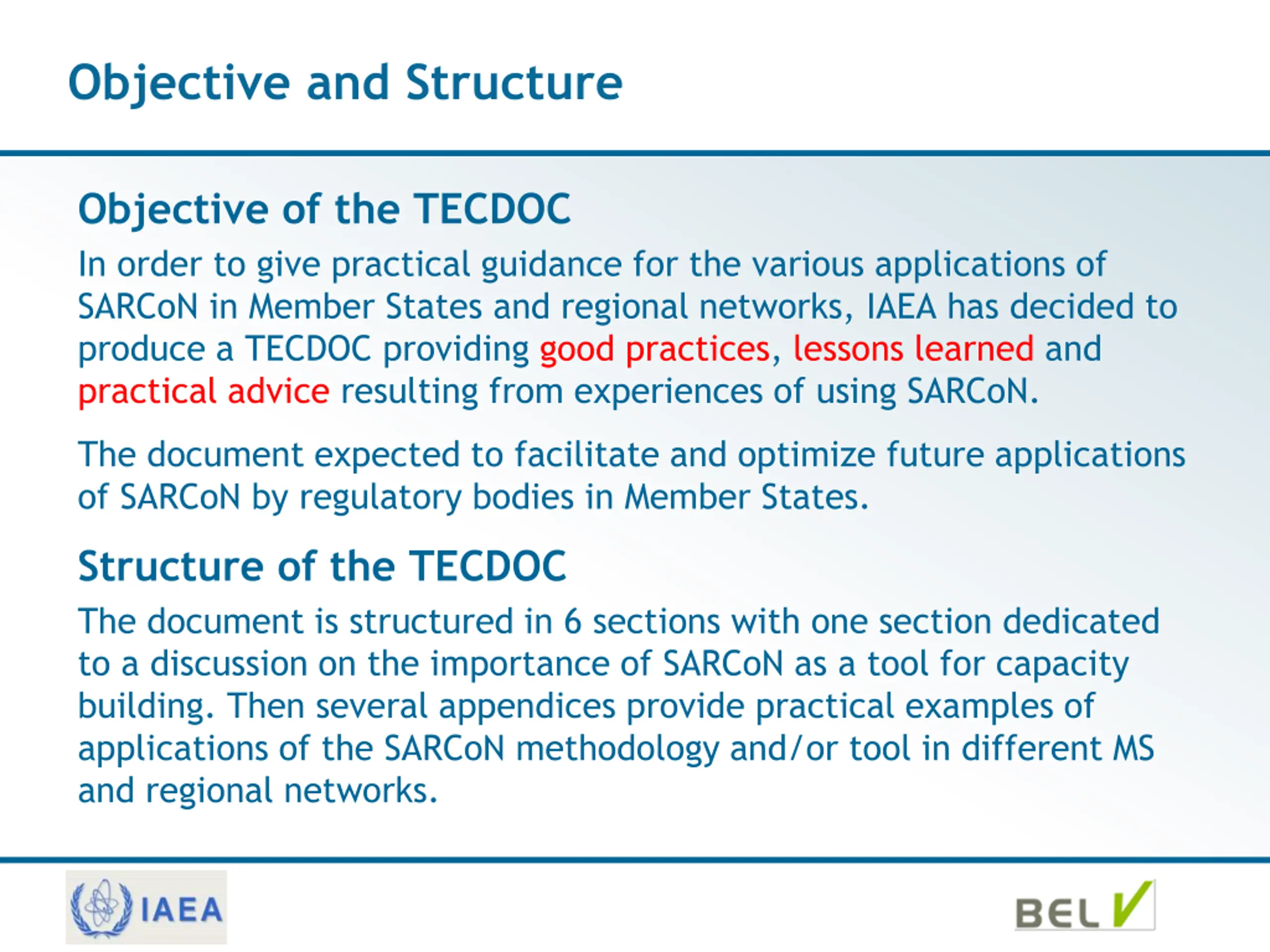 Objective and Structure Objective of the TECDOC In order to give practical guidance for the various applications of SARCoN in Member States and regional networks, IAEA has decided to produce a TECDOC providing good practices, lessons learned and practical advice resulting from experiences of using SARCoN. The document expected to facilitate and optimize future applications of SARCoN by regulatory bodies in Member States. Structure of the TECDOC The document is structured in 6 sections with one section dedicated to a discussion on the importance of SARCoN as a tool for capacity building. Then several appendices provide practical examples of applications of the SARCoN methodology and/or tool in different MS and regional networks.