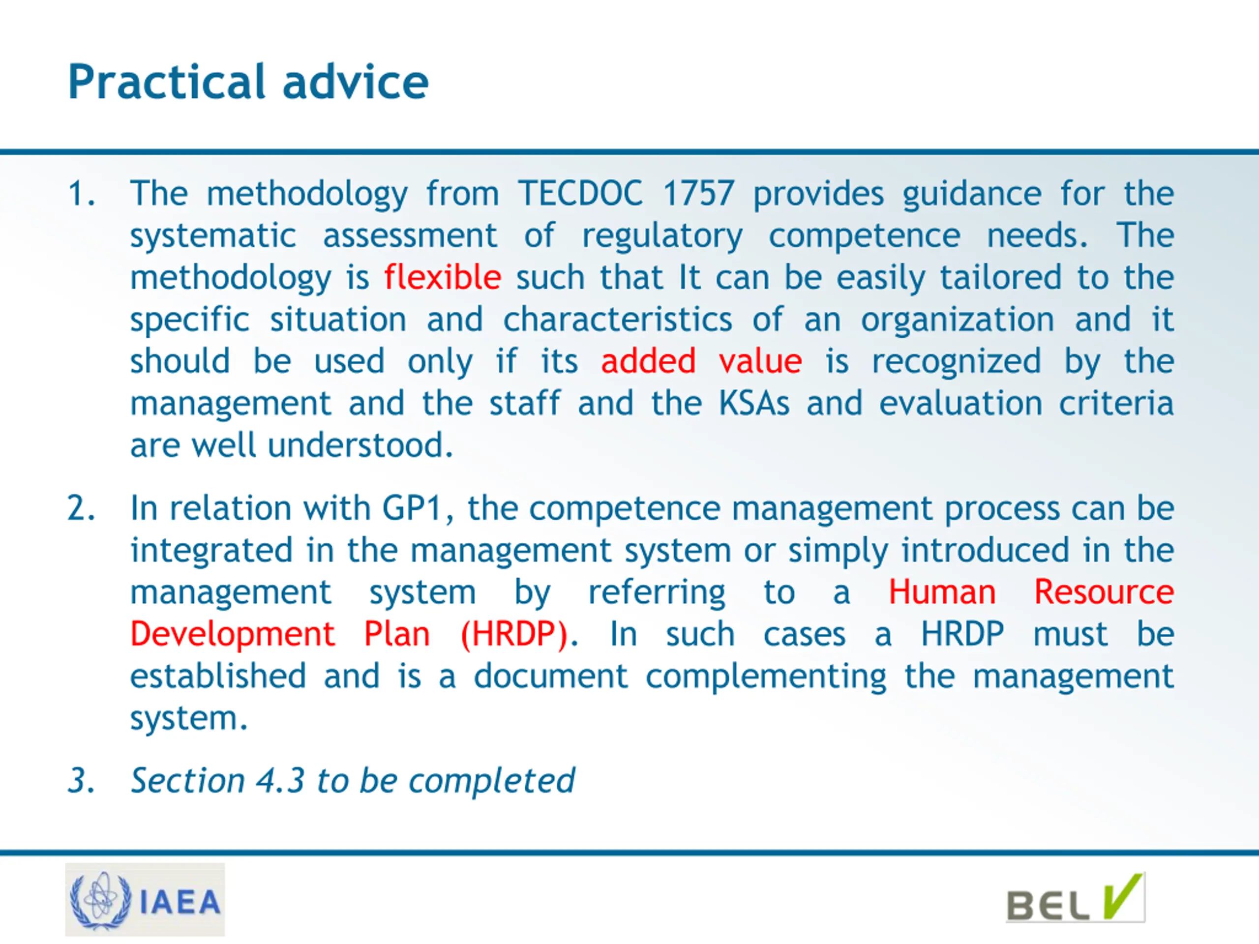 Practical advice 1. The methodology from TECDOC 1757 provides guidance for the systematic assessment of regulatory competence needs. The methodology is flexible such that It can be easily tailored to the specific situation and characteristics of an organization and it should be used only if its added value is recognized by the management and the staff and the KSAs and evaluation criteria are well understood. 2. In relation with GP1, the competence management process can be integrated in the management system or simply introduced in the management system by referring Development Plan (HRDP). In such cases a HRDP must be established and is a document complementing the management system. to a Human Resource 3. Section 4.3 to be completed