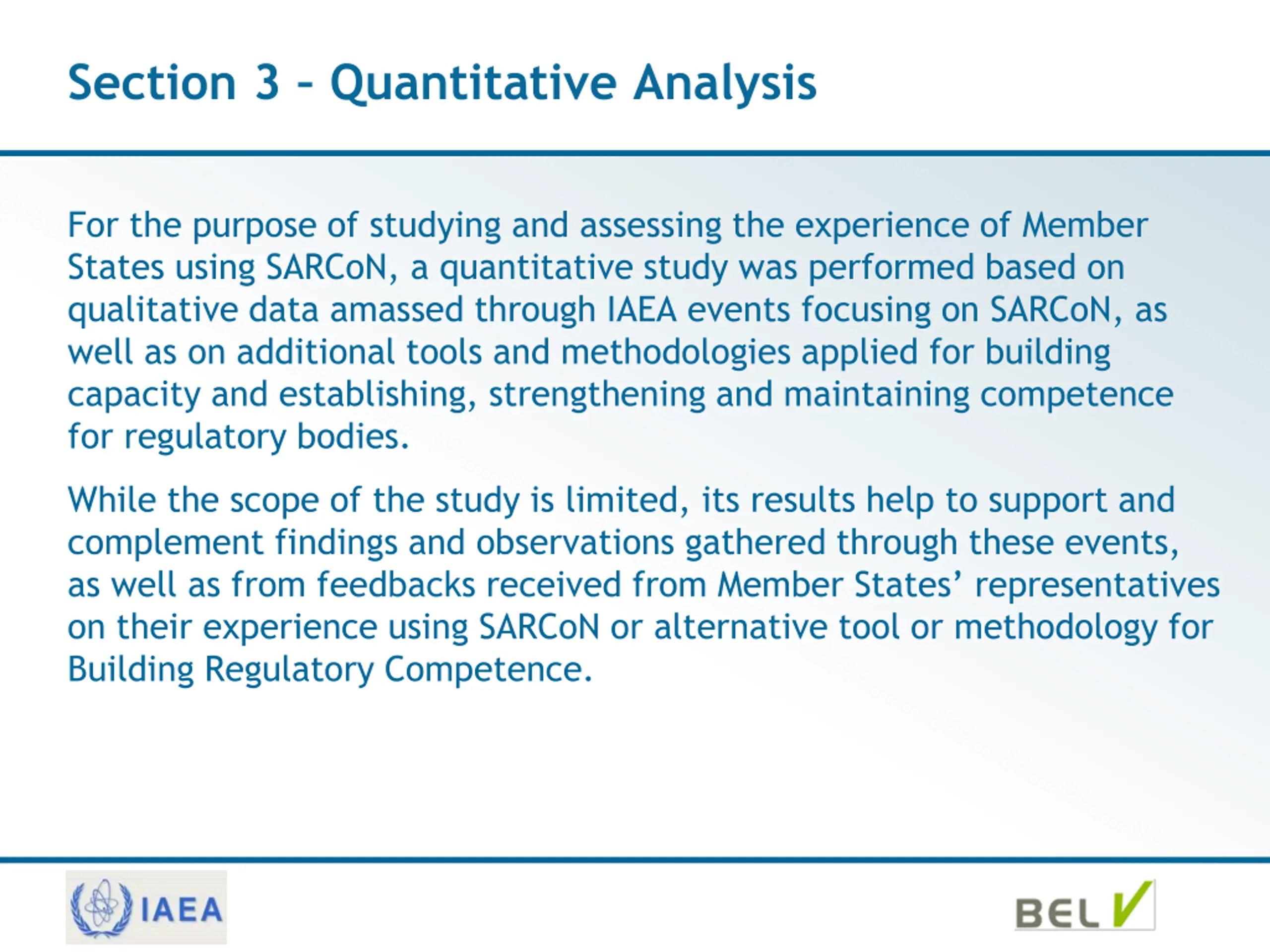 Section 3 Quantitative Analysis For the purpose of studying and assessing the experience of Member States using SARCoN, a quantitative study was performed based on qualitative data amassed through IAEA events focusing on SARCoN, as well as on additional tools and methodologies applied for building capacity and establishing, strengthening and maintaining competence for regulatory bodies. While the scope of the study is limited, its results help to support and complement findings and observations gathered through these events, as well as from feedbacks received from Member States representatives on their experience using SARCoN or alternative tool or methodology for Building Regulatory Competence.