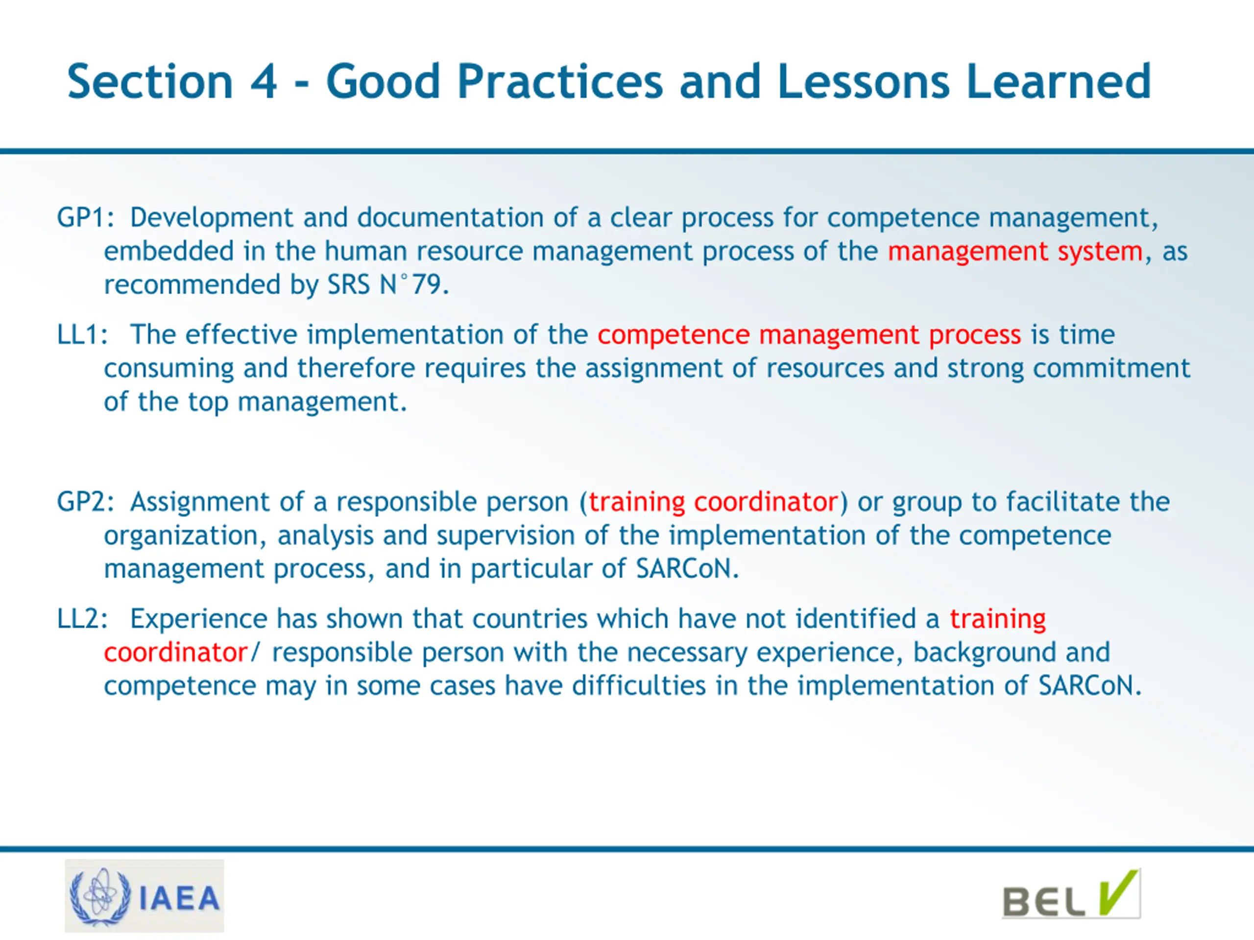 Section 4 - Good Practices and Lessons Learned GP1: Development and documentation of a clear process for competence management, embedded in the human resource management process of the management system, as recommended by SRS N 79. LL1: The effective implementation of the competence management process is time consuming and therefore requires the assignment of resources and strong commitment of the top management. GP2: Assignment of a responsible person (training coordinator) or group to facilitate the organization, analysis and supervision of the implementation of the competence management process, and in particular of SARCoN. LL2: Experience has shown that countries which have not identified a training coordinator/ responsible person with the necessary experience, background and competence may in some cases have difficulties in the implementation of SARCoN.