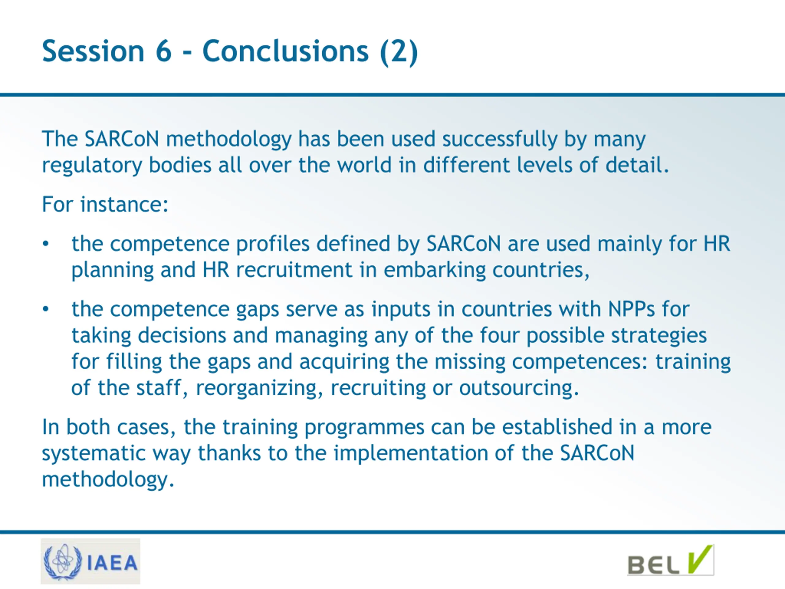 Session 6 - Conclusions (2) The SARCoN methodology has been used successfully by many regulatory bodies all over the world in different levels of detail. For instance: the competence profiles defined by SARCoN are used mainly for HR planning and HR recruitment in embarking countries, the competence gaps serve as inputs in countries with NPPs for taking decisions and managing any of the four possible strategies for filling the gaps and acquiring the missing competences: training of the staff, reorganizing, recruiting or outsourcing. In both cases, the training programmes can be established in a more systematic way thanks to the implementation of the SARCoN methodology.