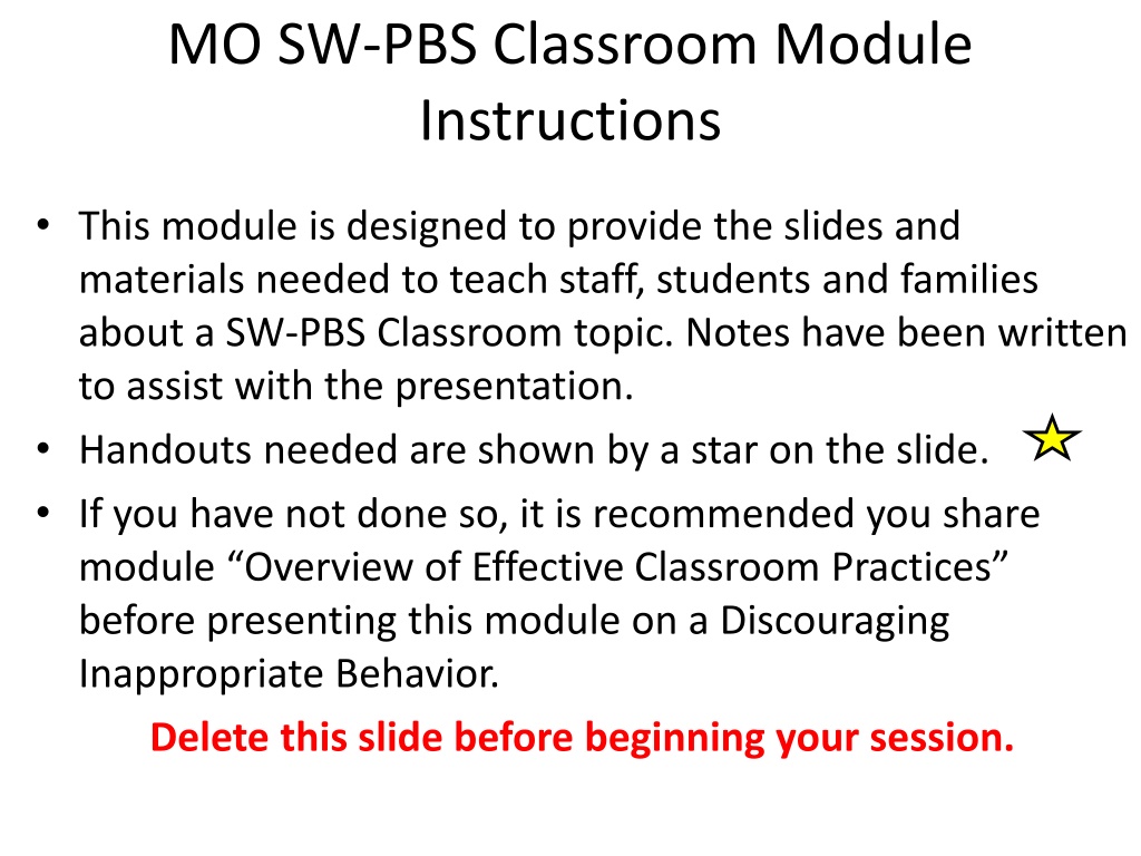MO SW-PBS Classroom Module Instructions This module is designed to provide the slides and materials needed to teach staff, students and families about a SW-PBS Classroom topic. Notes have been written to assist with the presentation. Handouts needed are shown by a star on the slide. If you have not done so, it is recommended you share module Overview of Effective Classroom Practices before presenting this module on a Discouraging Inappropriate Behavior. Delete this slide before beginning your session.