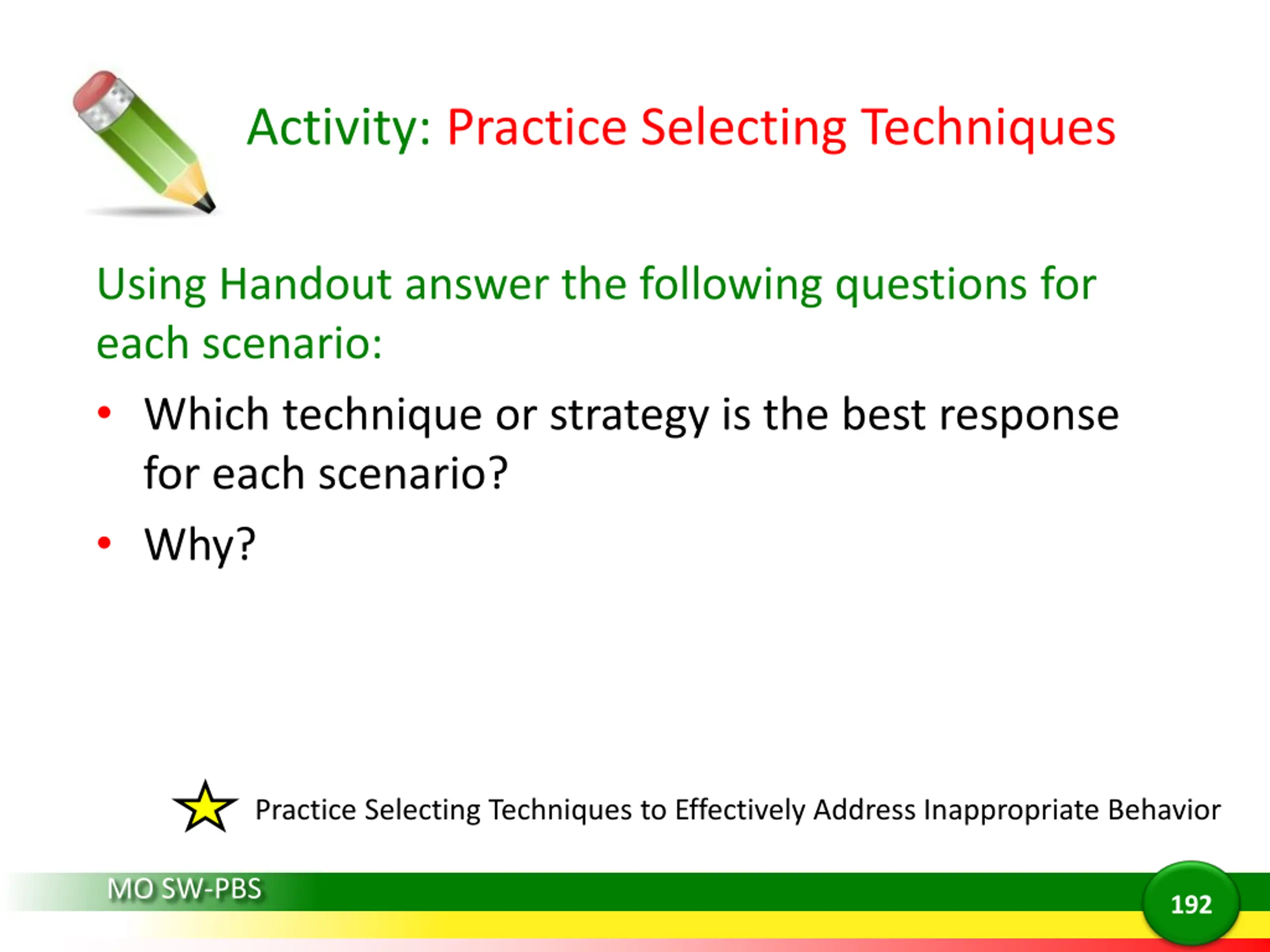 Activity: Practice Selecting Techniques Using Handout answer the following questions for each scenario: Which technique or strategy is the best response for each scenario? Why? Practice Selecting Techniques to Effectively Address Inappropriate Behavior MO SW-PBS 192