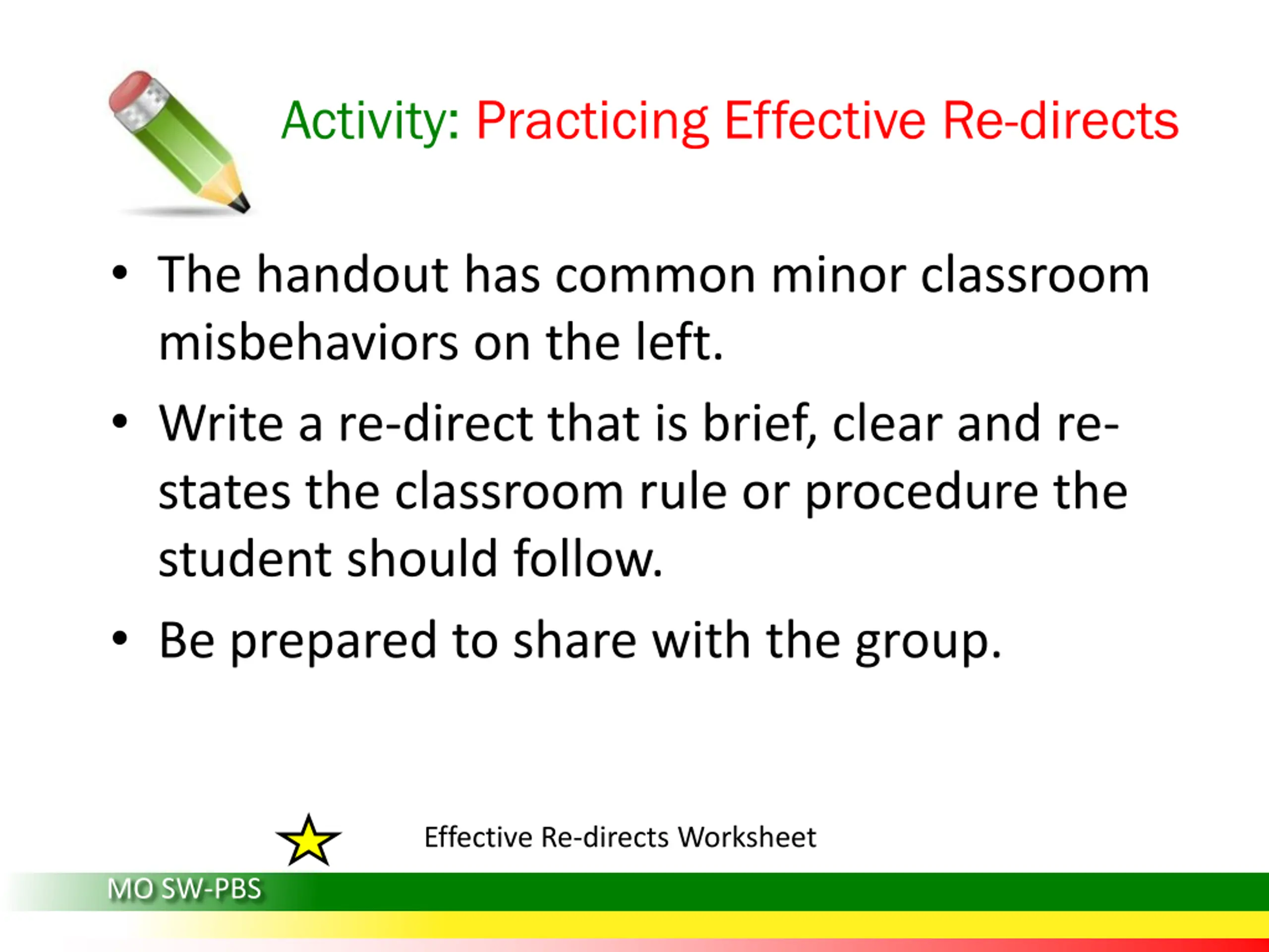 Activity: Practicing Effective Re-directs The handout has common minor classroom misbehaviors on the left. Write a re-direct that is brief, clear and re- states the classroom rule or procedure the student should follow. Be prepared to share with the group. Effective Re-directs Worksheet MO SW-PBS