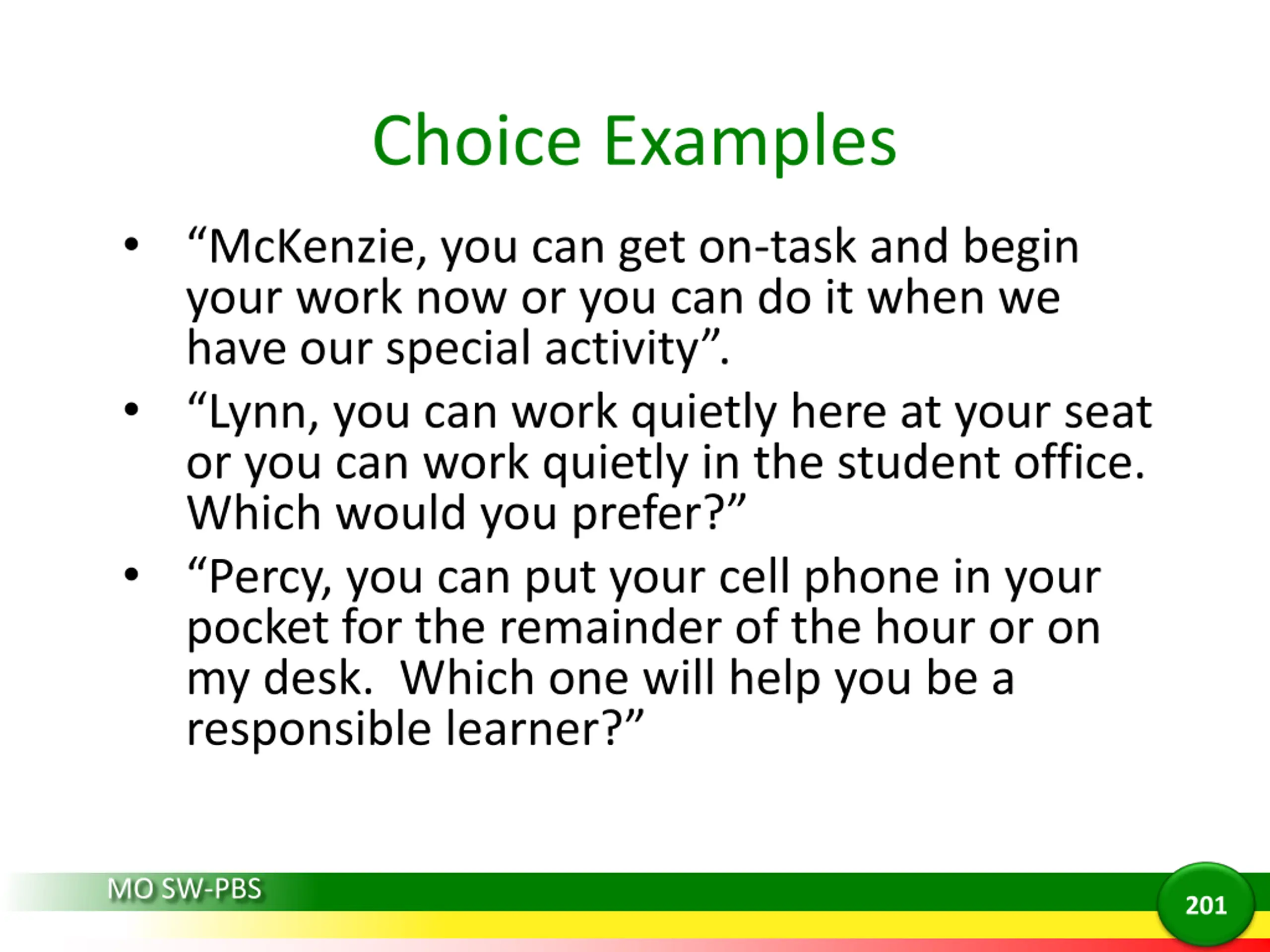 Choice Examples McKenzie, you can get on-task and begin your work now or you can do it when we have our special activity . Lynn, you can work quietly here at your seat or you can work quietly in the student office. Which would you prefer? Percy, you can put your cell phone in your pocket for the remainder of the hour or on my desk. Which one will help you be a responsible learner? MO SW-PBS 201