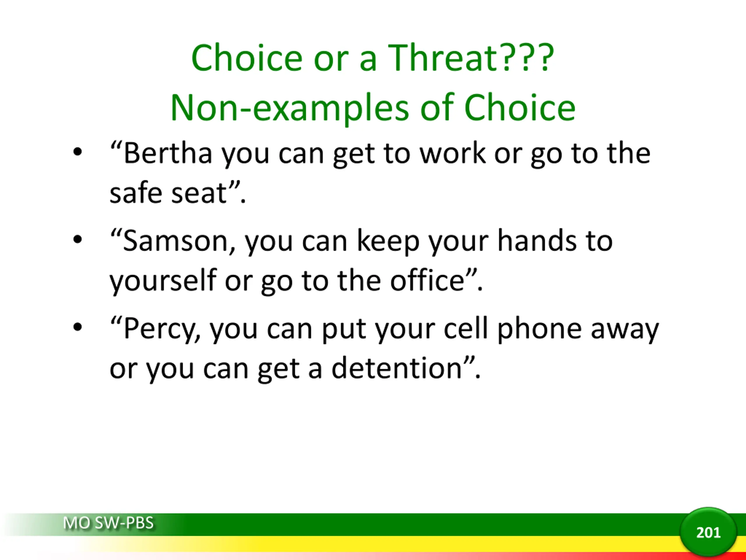 Choice or a Threat??? Non-examples of Choice Bertha you can get to work or go to the safe seat . Samson, you can keep your hands to yourself or go to the office . Percy, you can put your cell phone away or you can get a detention . MO SW-PBS 201