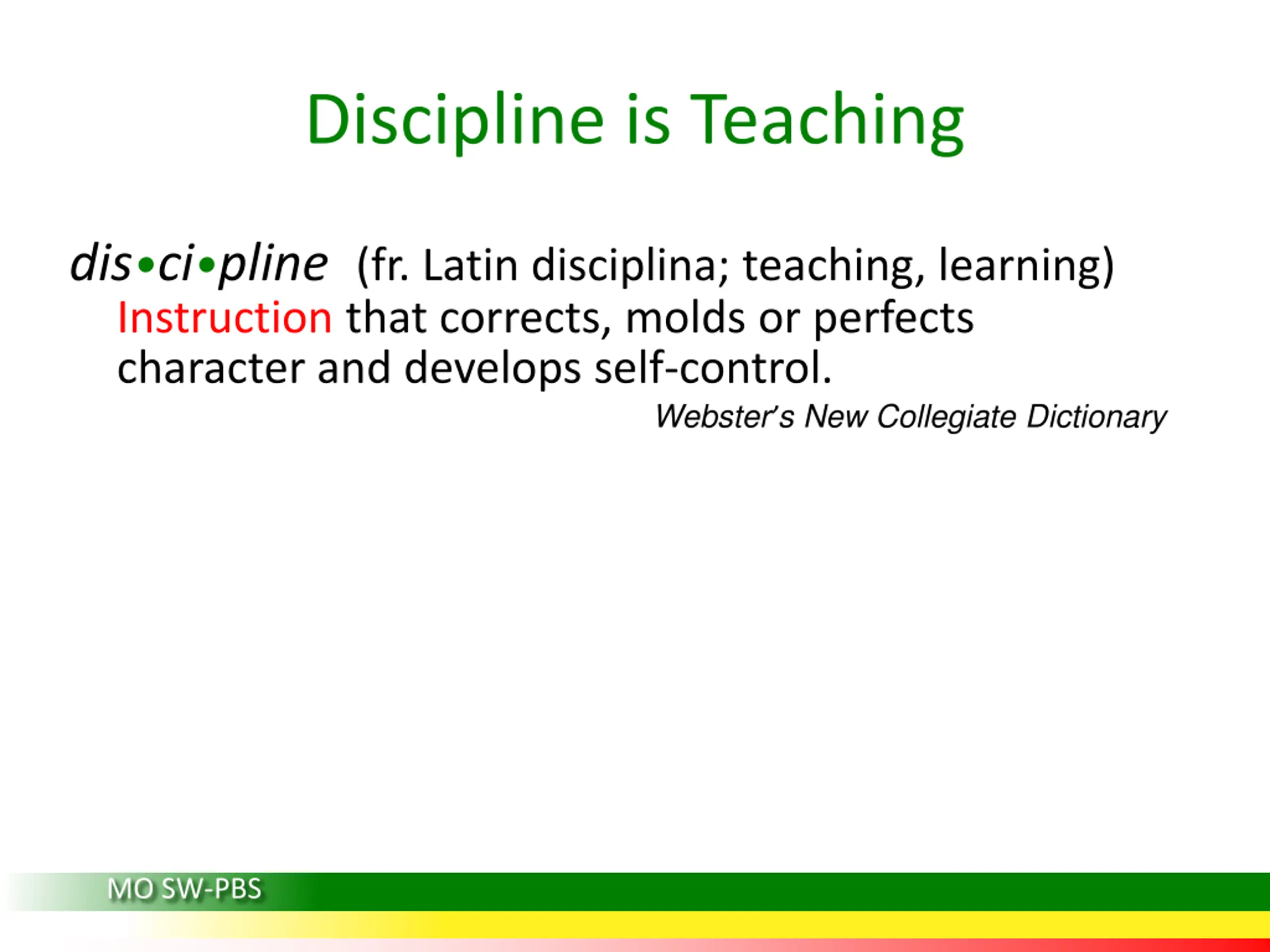 Discipline is Teaching dis ci pline (fr. Latin disciplina; teaching, learning) Instruction that corrects, molds or perfects character and develops self-control. Webster s New Collegiate Dictionary MO SW-PBS