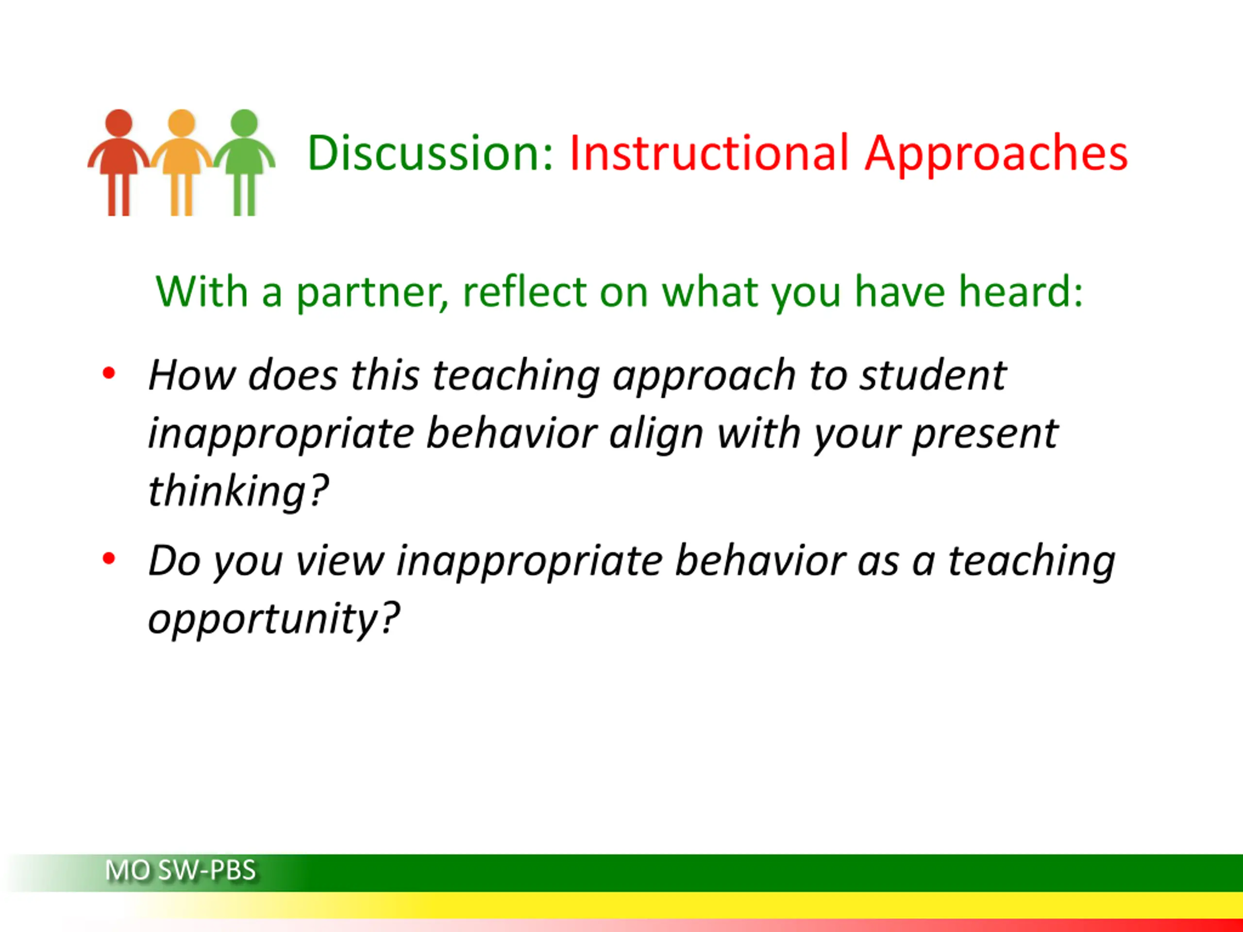 Discussion: Instructional Approaches With a partner, reflect on what you have heard: How does this teaching approach to student inappropriate behavior align with your present thinking? Do you view inappropriate behavior as a teaching opportunity? MO SW-PBS