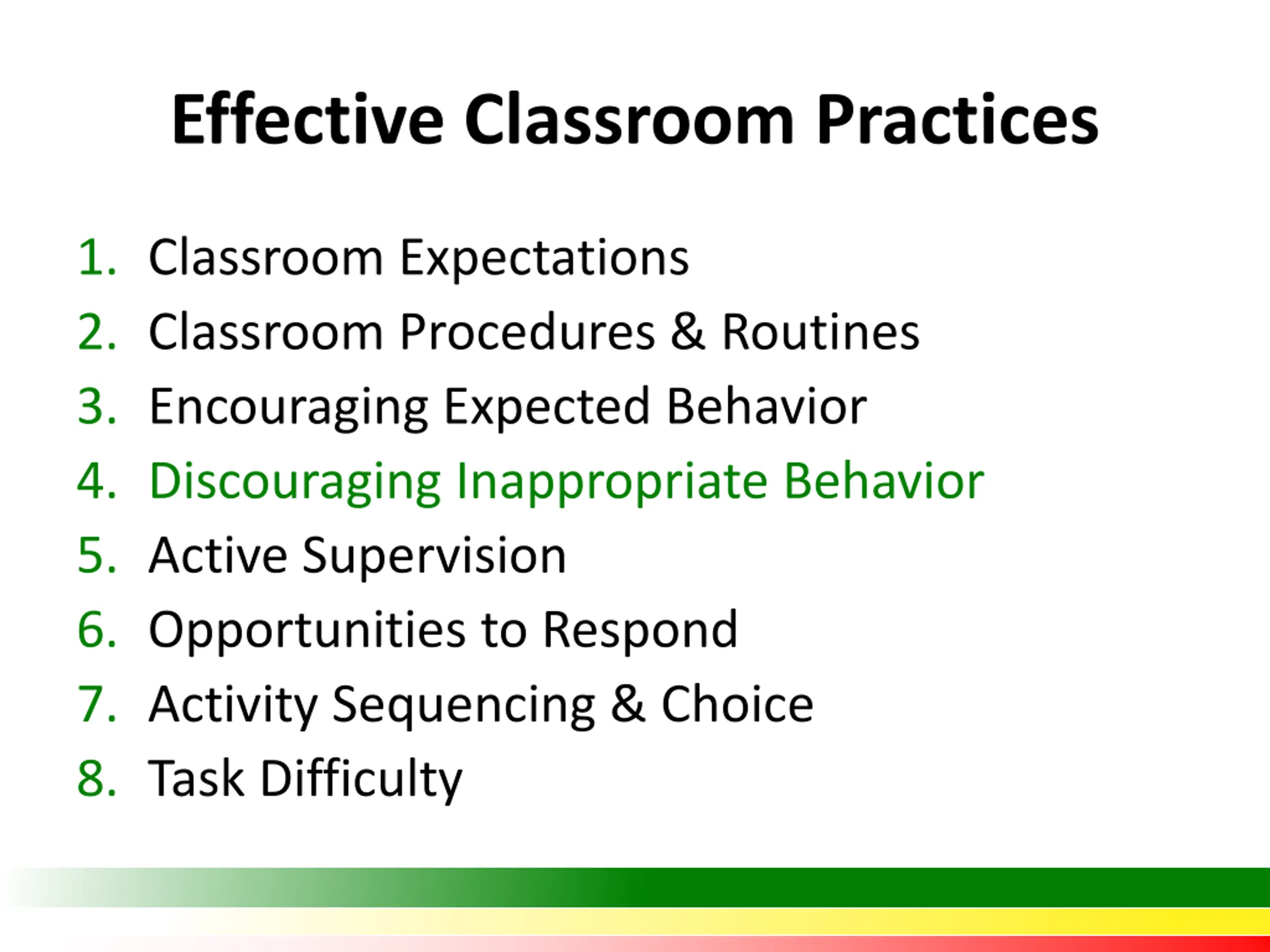 Effective Classroom Practices 1. Classroom Expectations 2. Classroom Procedures & Routines 3. Encouraging Expected Behavior 4. Discouraging Inappropriate Behavior 5. Active Supervision 6. Opportunities to Respond 7. Activity Sequencing & Choice 8. Task Difficulty