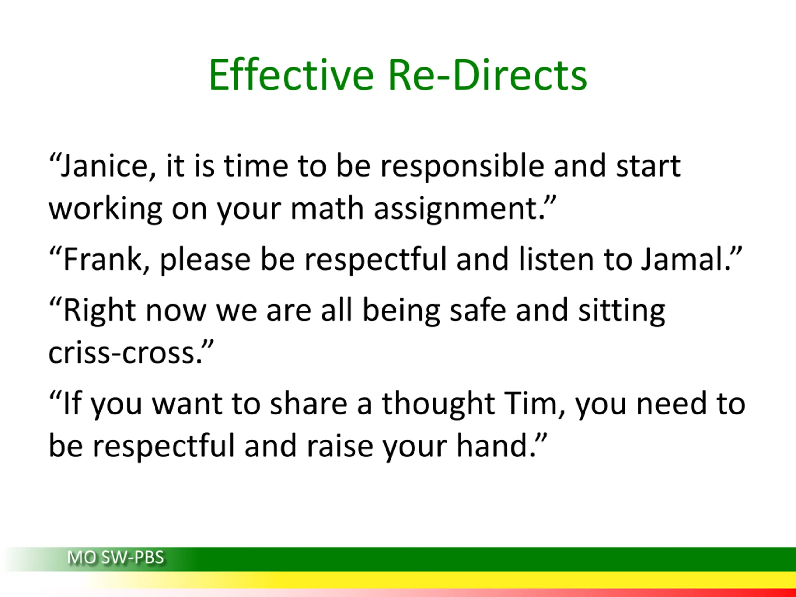 Effective Re-Directs Janice, it is time to be responsible and start working on your math assignment. Frank, please be respectful and listen to Jamal. Right now we are all being safe and sitting criss-cross. If you want to share a thought Tim, you need to be respectful and raise your hand. MO SW-PBS