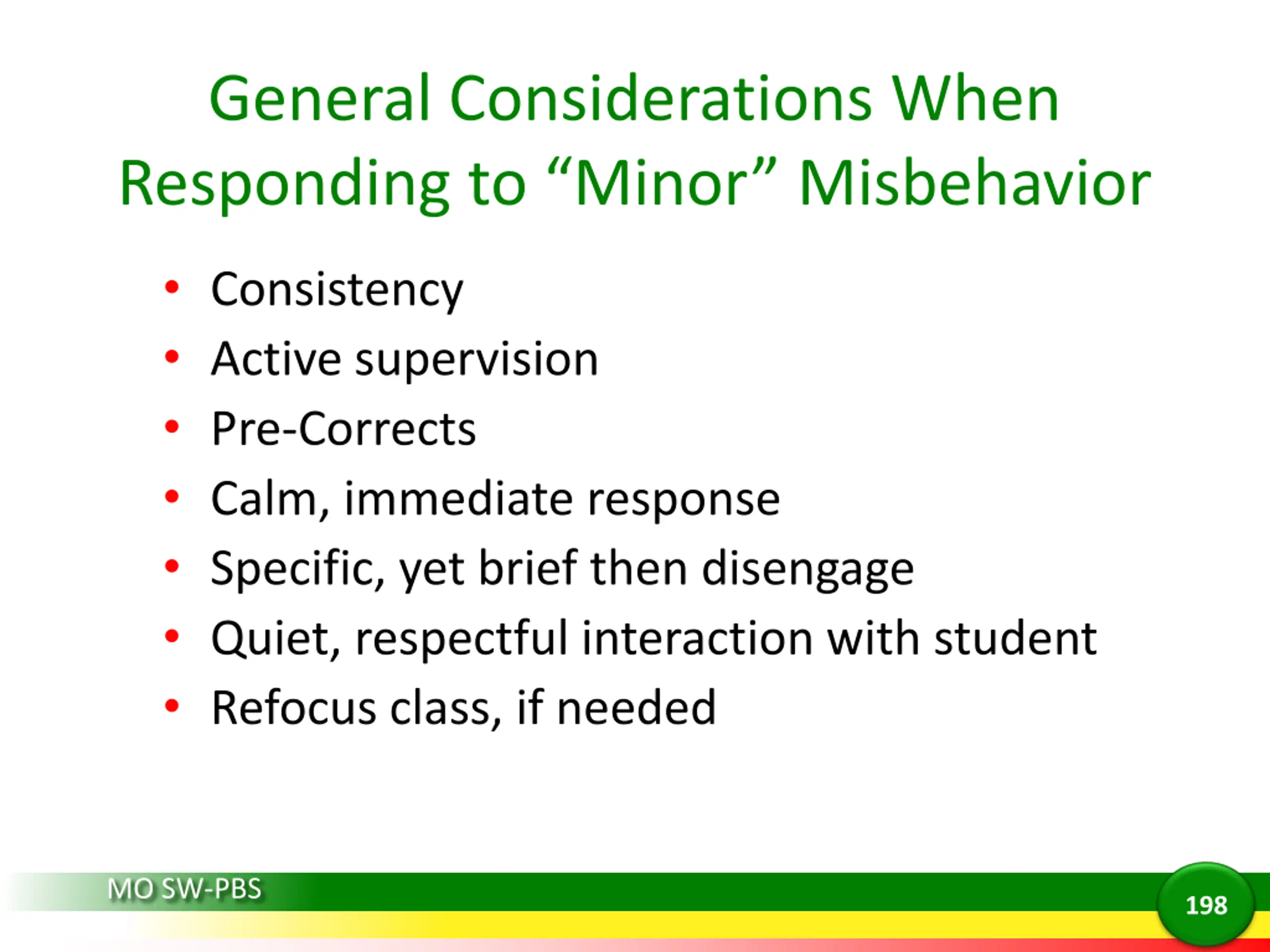 General Considerations When Responding to Minor Misbehavior Consistency Active supervision Pre-Corrects Calm, immediate response Specific, yet brief then disengage Quiet, respectful interaction with student Refocus class, if needed MO SW-PBS 198