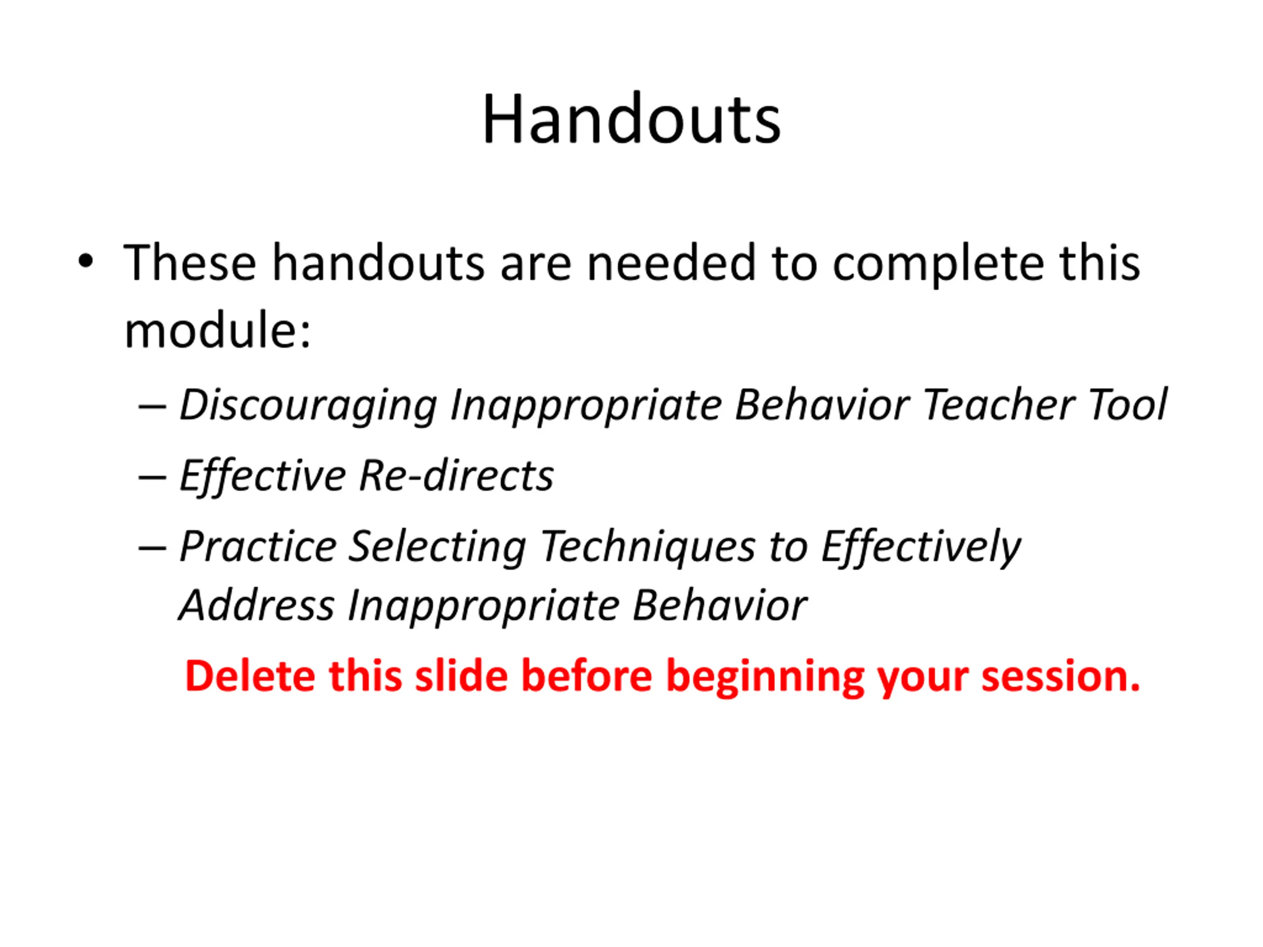 Handouts These handouts are needed to complete this module: Discouraging Inappropriate Behavior Teacher Tool Effective Re-directs Practice Selecting Techniques to Effectively Address Inappropriate Behavior Delete this slide before beginning your session.
