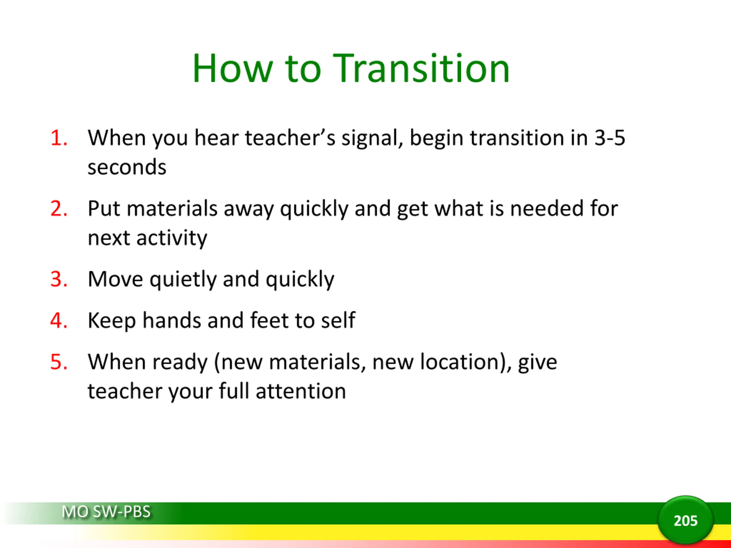 How to Transition 1. When you hear teacher s signal, begin transition in 3-5 seconds 2. Put materials away quickly and get what is needed for next activity 3. Move quietly and quickly 4. Keep hands and feet to self 5. When ready (new materials, new location), give teacher your full attention MO SW-PBS 205
