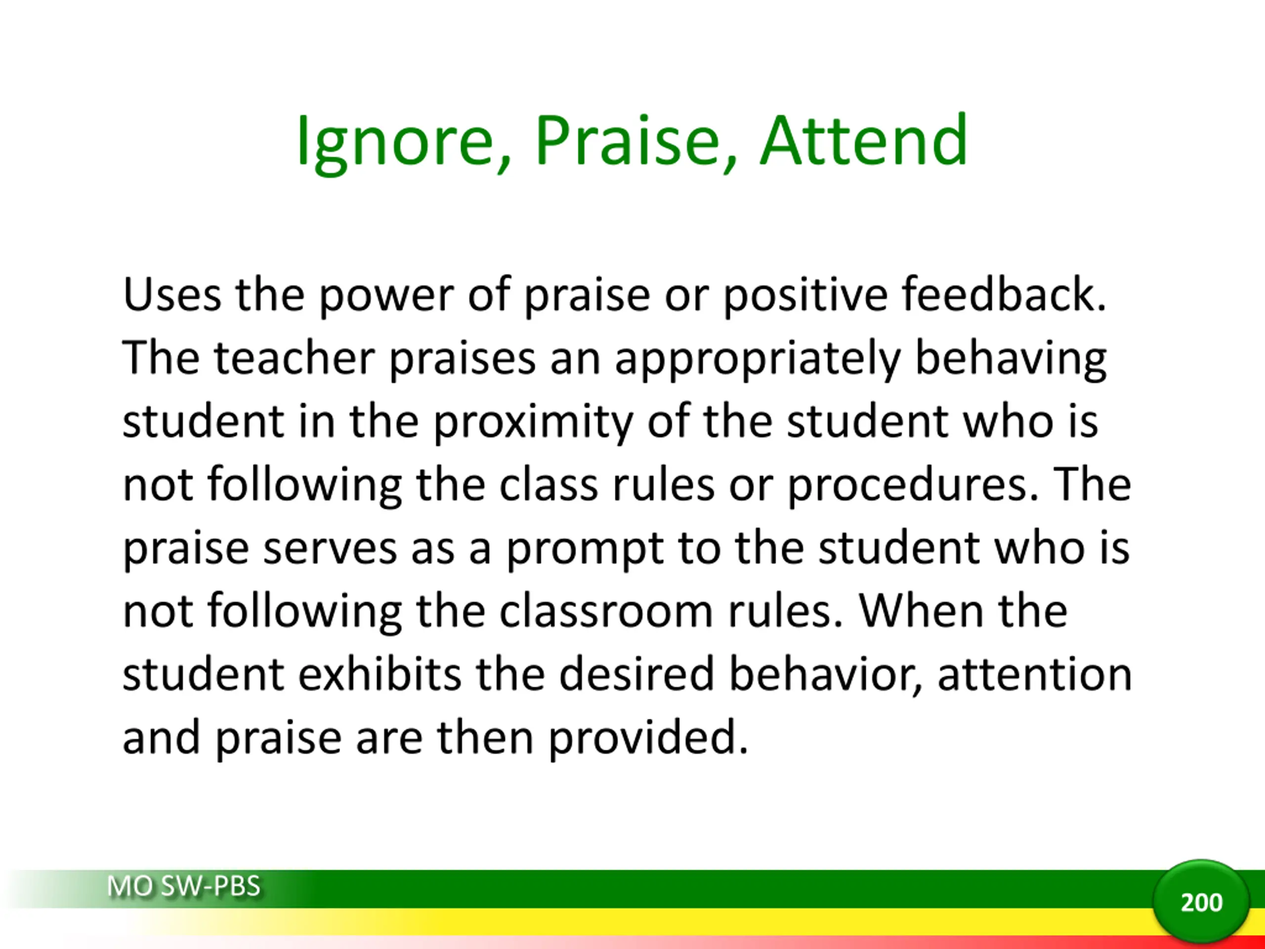 Ignore, Praise, Attend Uses the power of praise or positive feedback. The teacher praises an appropriately behaving student in the proximity of the student who is not following the class rules or procedures. The praise serves as a prompt to the student who is not following the classroom rules. When the student exhibits the desired behavior, attention and praise are then provided. MO SW-PBS 200