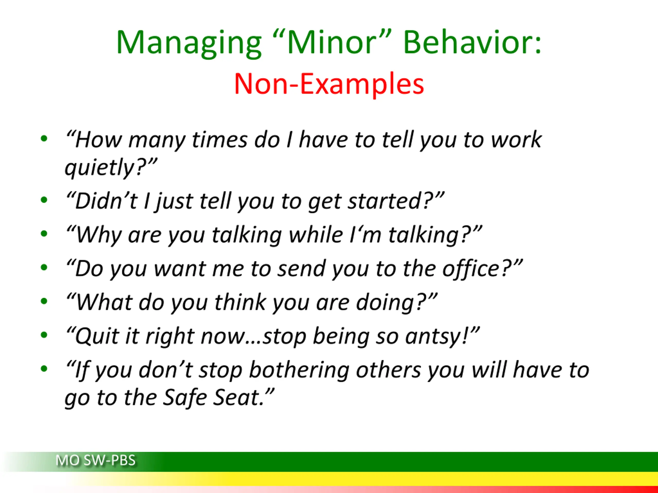 Managing Minor Behavior: Non-Examples How many times do I have to tell you to work quietly? Didn t I just tell you to get started? Why are you talking while I m talking? Do you want me to send you to the office? What do you think you are doing? Quit it right now stop being so antsy! If you don t stop bothering others you will have to go to the Safe Seat. MO SW-PBS