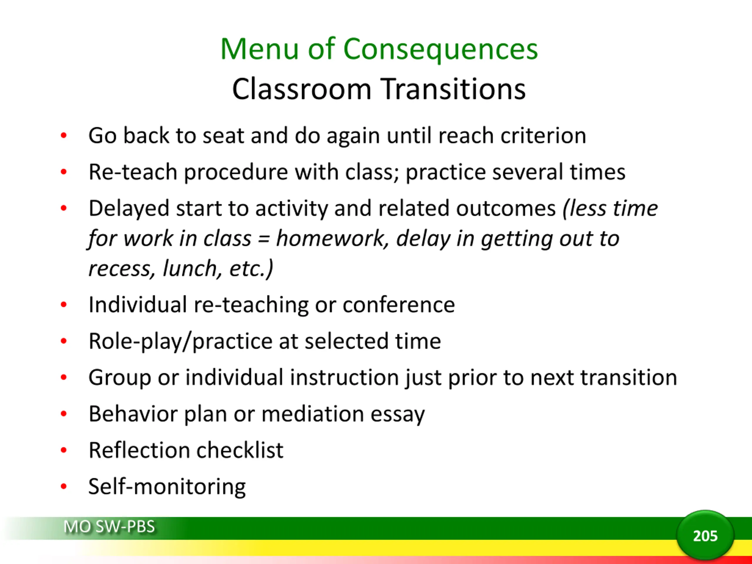 Menu of Consequences Classroom Transitions Go back to seat and do again until reach criterion Re-teach procedure with class; practice several times Delayed start to activity and related outcomes (less time for work in class = homework, delay in getting out to recess, lunch, etc.) Individual re-teaching or conference Role-play/practice at selected time Group or individual instruction just prior to next transition Behavior plan or mediation essay Reflection checklist Self-monitoring MO SW-PBS 205