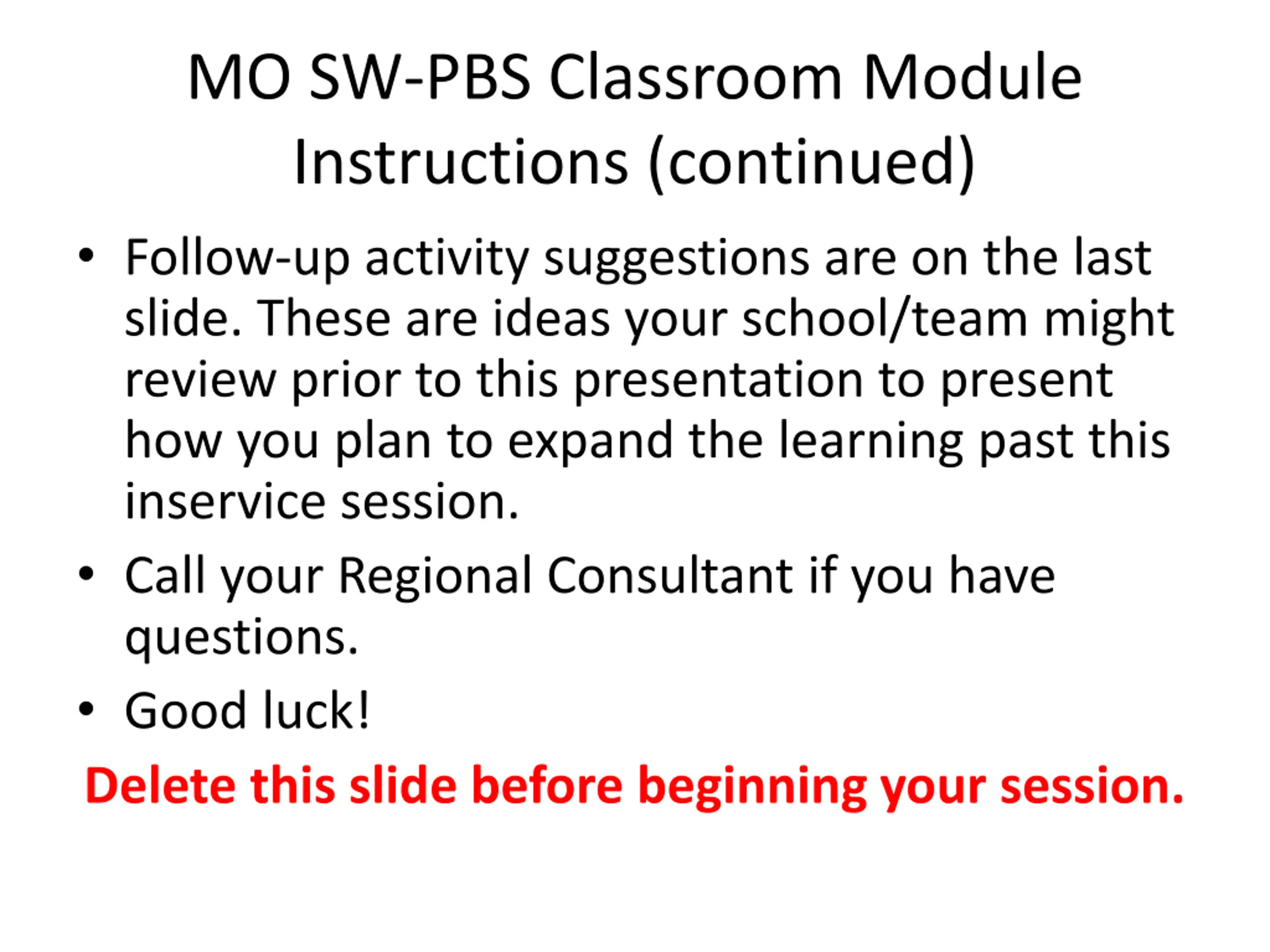 MO SW-PBS Classroom Module Instructions (continued) Follow-up activity suggestions are on the last slide. These are ideas your school/team might review prior to this presentation to present how you plan to expand the learning past this inservice session. Call your Regional Consultant if you have questions. Good luck! Delete this slide before beginning your session.