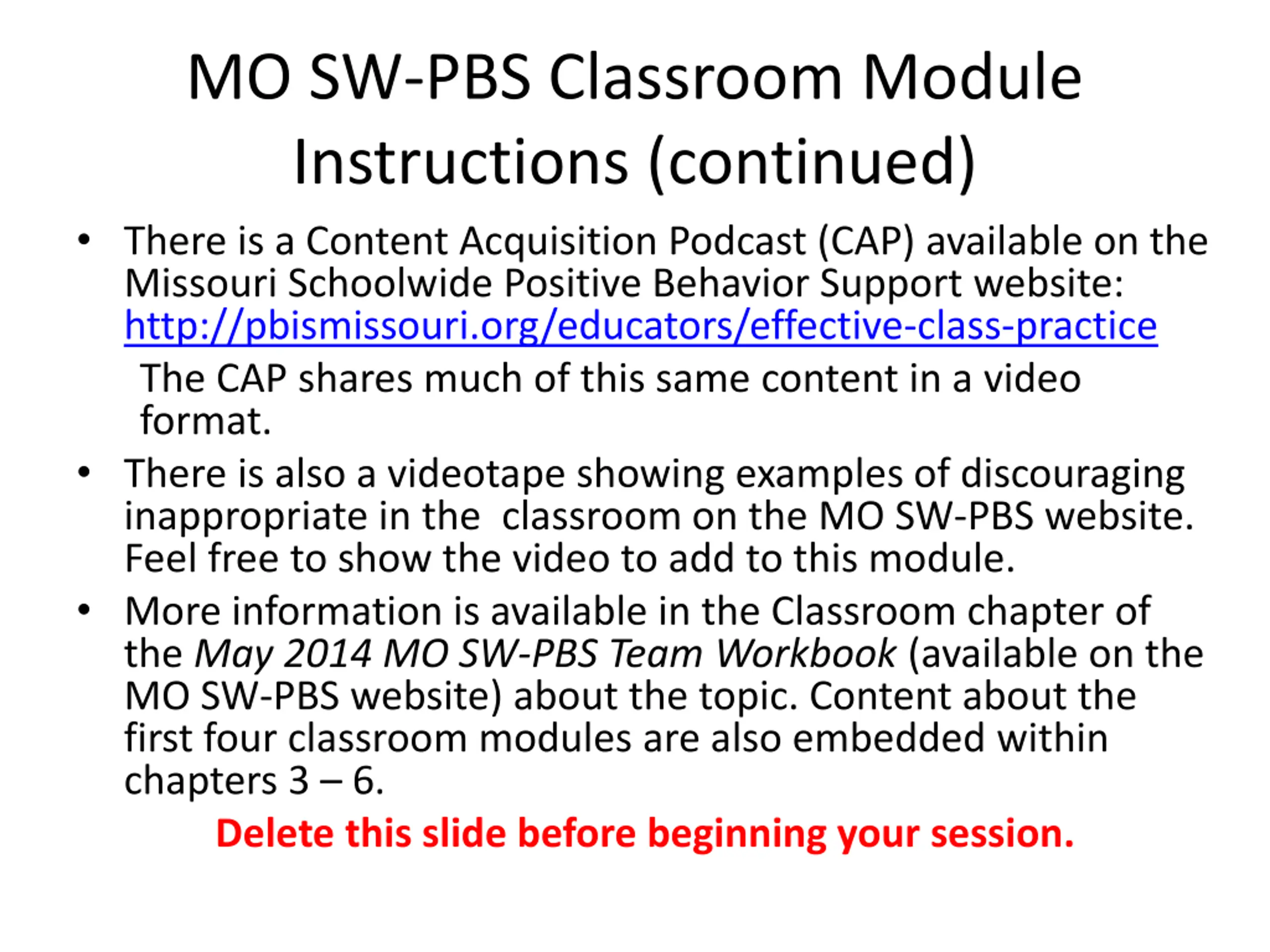 MO SW-PBS Classroom Module Instructions (continued) There is a Content Acquisition Podcast (CAP) available on the Missouri Schoolwide Positive Behavior Support website: http://pbismissouri.org/educators/effective-class-practice The CAP shares much of this same content in a video format. There is also a videotape showing examples of discouraging inappropriate in the classroom on the MO SW-PBS website. Feel free to show the video to add to this module. More information is available in the Classroom chapter of the May 2014 MO SW-PBS Team Workbook (available on the MO SW-PBS website) about the topic. Content about the first four classroom modules are also embedded within chapters 3 6. Delete this slide before beginning your session.