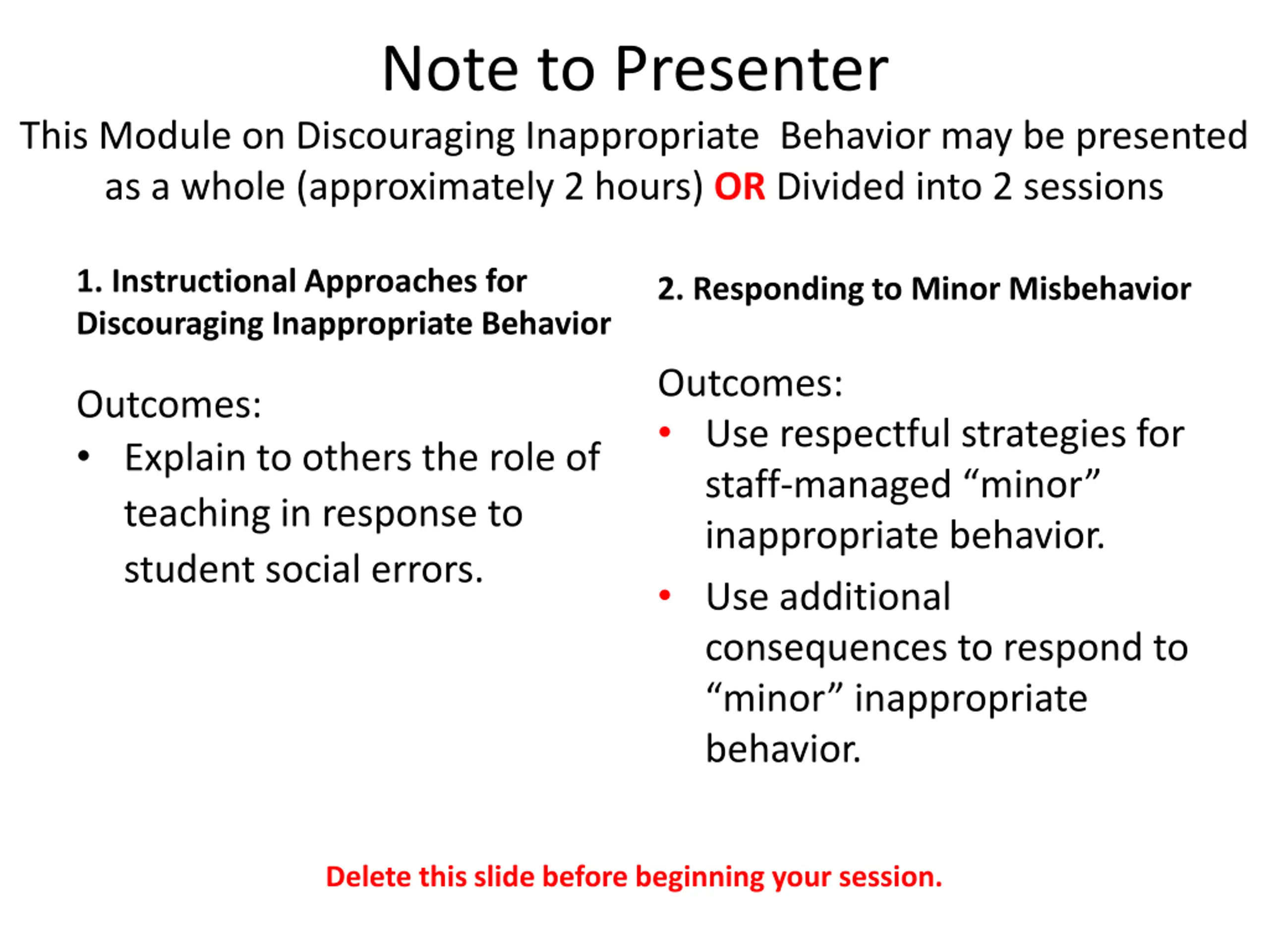 Note to Presenter This Module on Discouraging Inappropriate Behavior may be presented as a whole (approximately 2 hours) OR Divided into 2 sessions 1. Instructional Approaches for Discouraging Inappropriate Behavior 2. Responding to Minor Misbehavior Outcomes: Use respectful strategies for staff-managed minor inappropriate behavior. Use additional consequences to respond to minor inappropriate behavior. Outcomes: Explain to others the role of teaching in response to student social errors. Delete this slide before beginning your session.