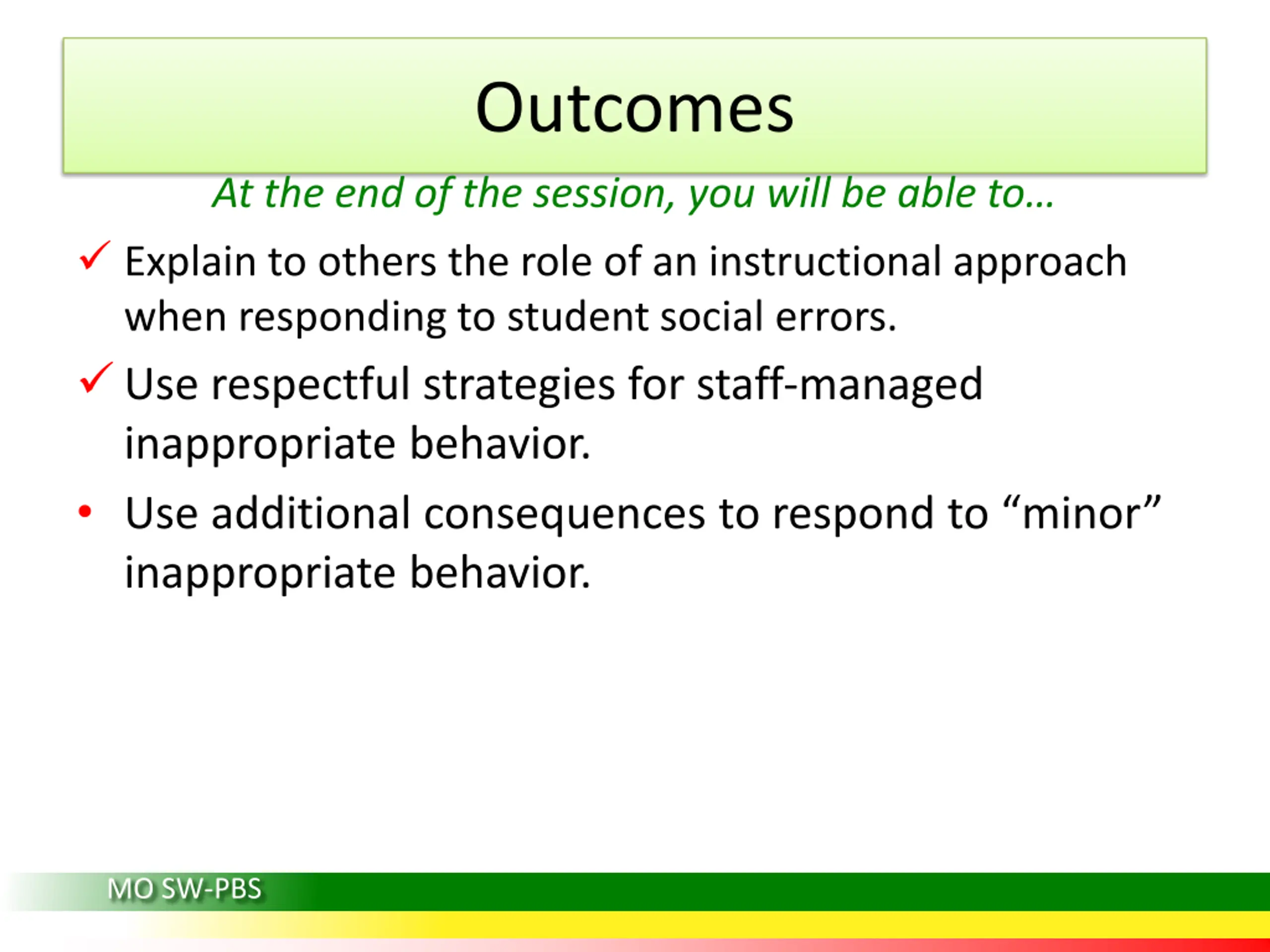 Outcomes At the end of the session, you will be able to Explain to others the role of an instructional approach when responding to student social errors. Use respectful strategies for staff-managed inappropriate behavior. Use additional consequences to respond to minor inappropriate behavior. MO SW-PBS