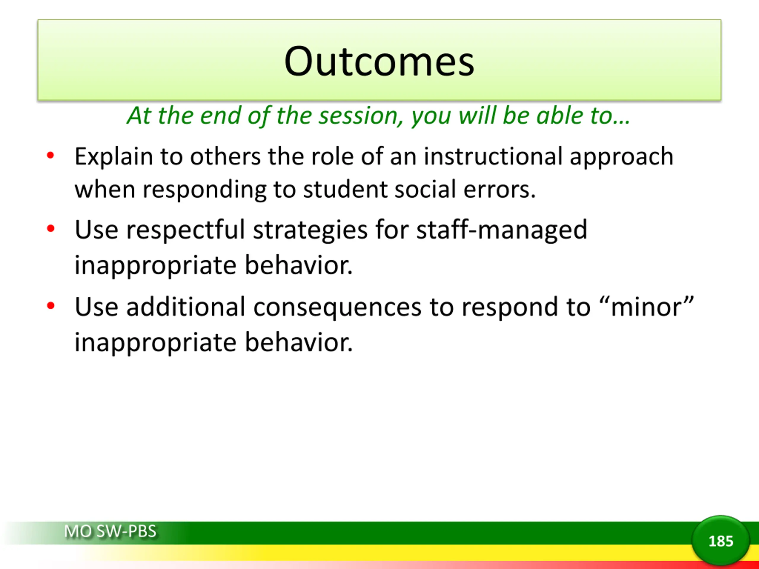 Outcomes At the end of the session, you will be able to Explain to others the role of an instructional approach when responding to student social errors. Use respectful strategies for staff-managed inappropriate behavior. Use additional consequences to respond to minor inappropriate behavior. MO SW-PBS 185