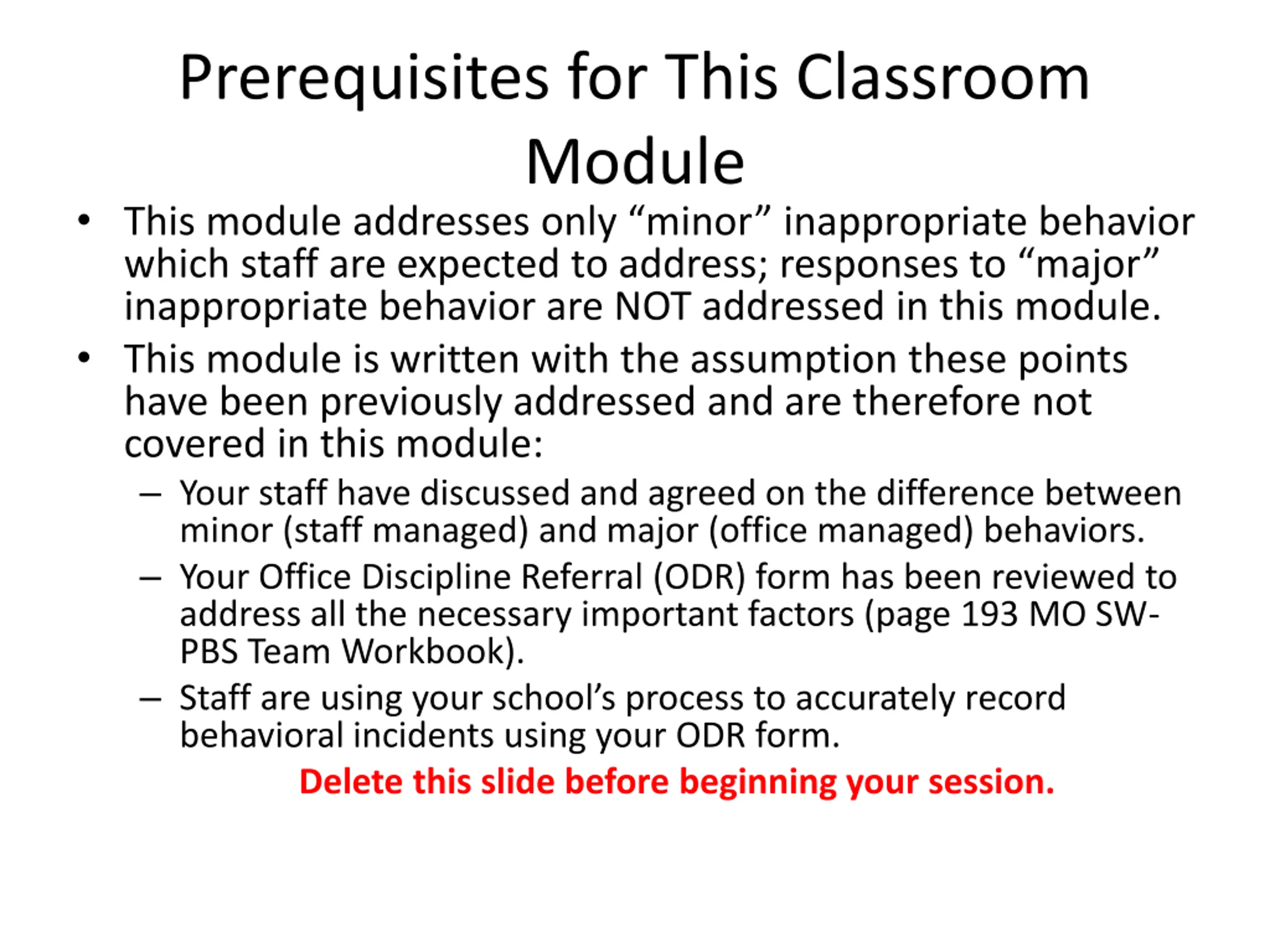 Prerequisites for This Classroom Module This module addresses only minor inappropriate behavior which staff are expected to address; responses to major inappropriate behavior are NOT addressed in this module. This module is written with the assumption these points have been previously addressed and are therefore not covered in this module: Your staff have discussed and agreed on the difference between minor (staff managed) and major (office managed) behaviors. Your Office Discipline Referral (ODR) form has been reviewed to address all the necessary important factors (page 193 MO SW- PBS Team Workbook). Staff are using your school s process to accurately record behavioral incidents using your ODR form. Delete this slide before beginning your session.