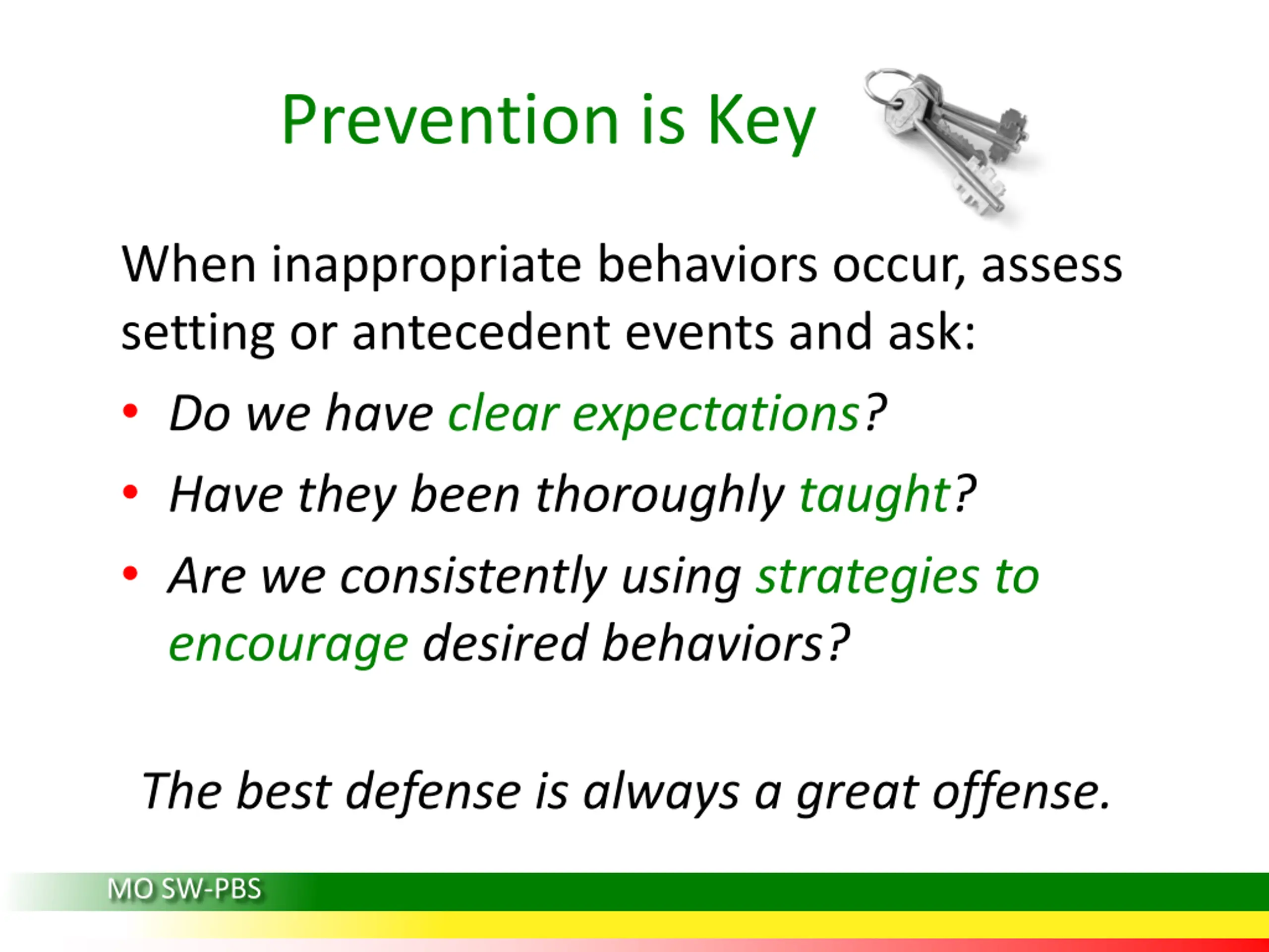Prevention is Key When inappropriate behaviors occur, assess setting or antecedent events and ask: Do we have clear expectations? Have they been thoroughly taught? Are we consistently using strategies to encourage desired behaviors? The best defense is always a great offense. MO SW-PBS