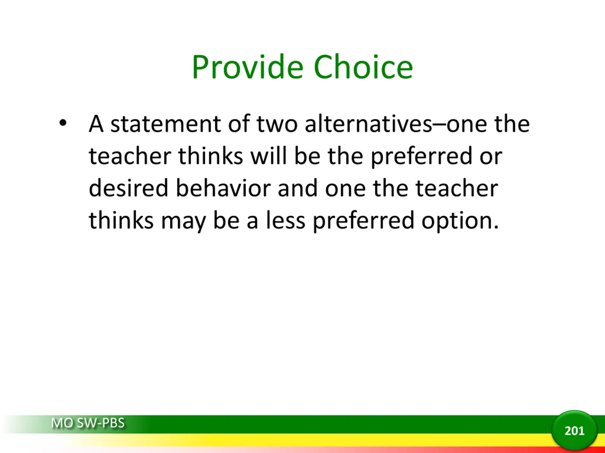 Provide Choice A statement of two alternatives one the teacher thinks will be the preferred or desired behavior and one the teacher thinks may be a less preferred option. MO SW-PBS 201