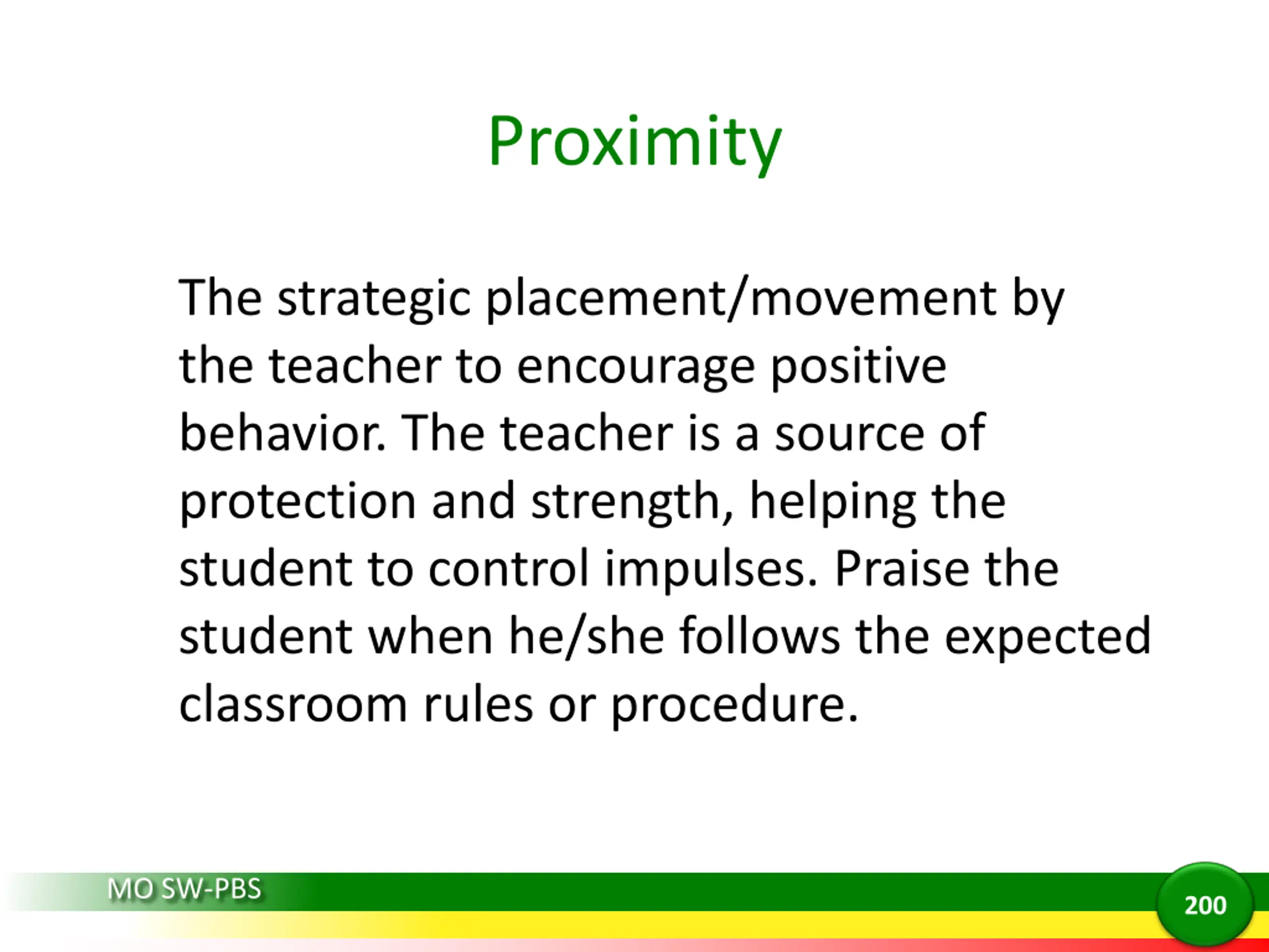 Proximity The strategic placement/movement by the teacher to encourage positive behavior. The teacher is a source of protection and strength, helping the student to control impulses. Praise the student when he/she follows the expected classroom rules or procedure. MO SW-PBS 200