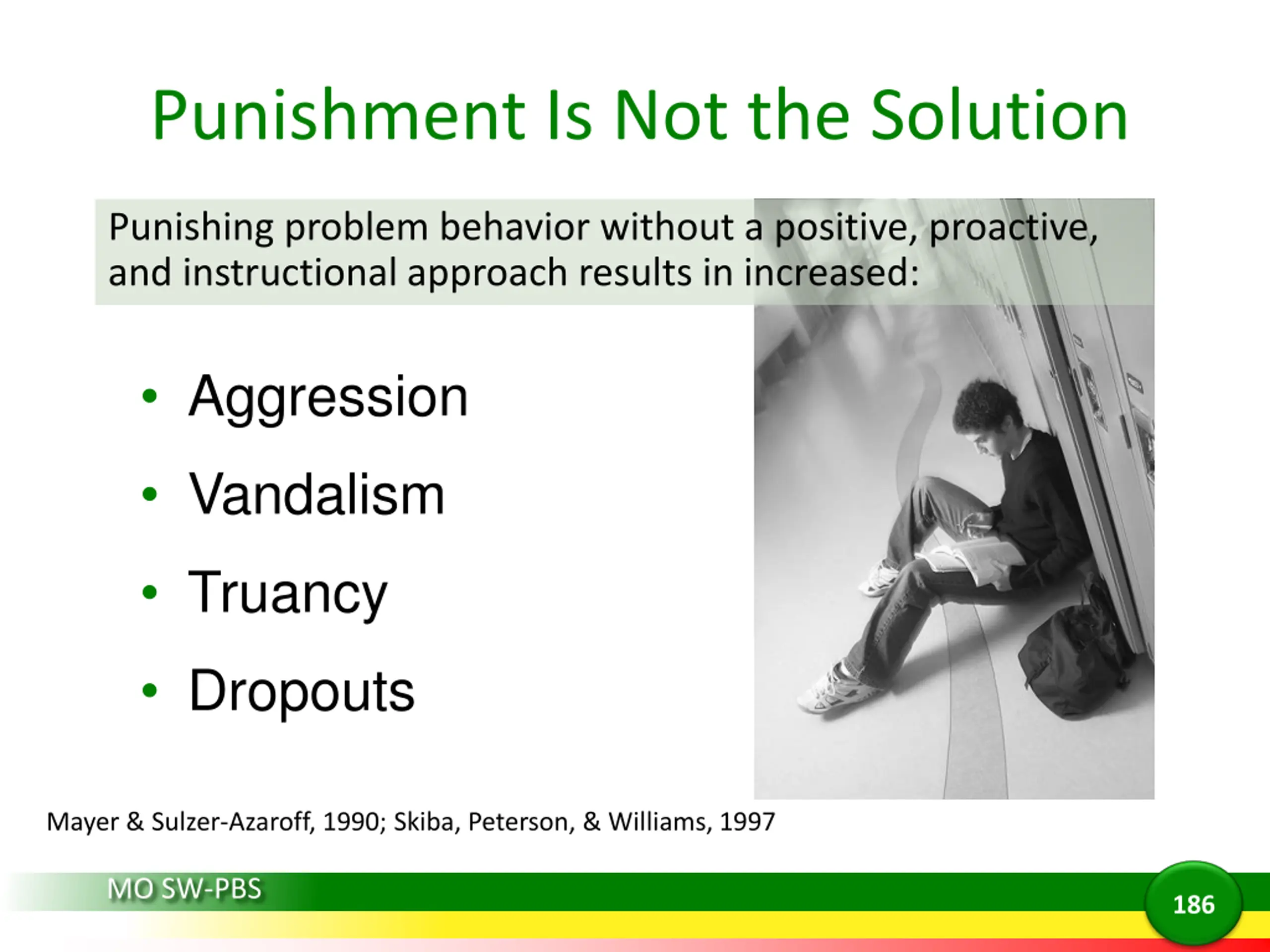 Punishment Is Not the Solution Punishing problem behavior without a positive, proactive, and instructional approach results in increased: Aggression Vandalism Truancy Dropouts Mayer & Sulzer-Azaroff, 1990; Skiba, Peterson, & Williams, 1997 MO SW-PBS 186