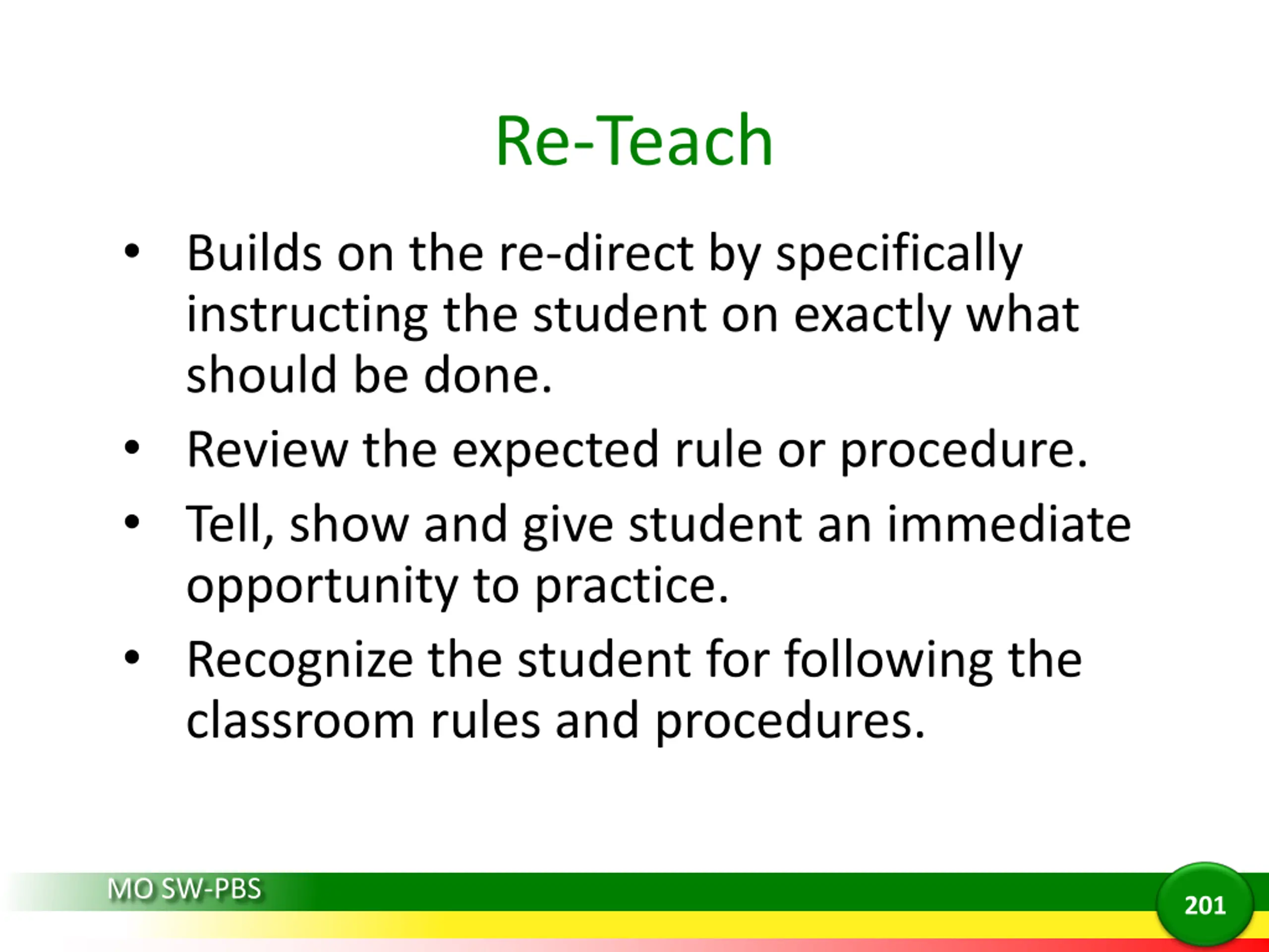 Re-Teach Builds on the re-direct by specifically instructing the student on exactly what should be done. Review the expected rule or procedure. Tell, show and give student an immediate opportunity to practice. Recognize the student for following the classroom rules and procedures. MO SW-PBS 201