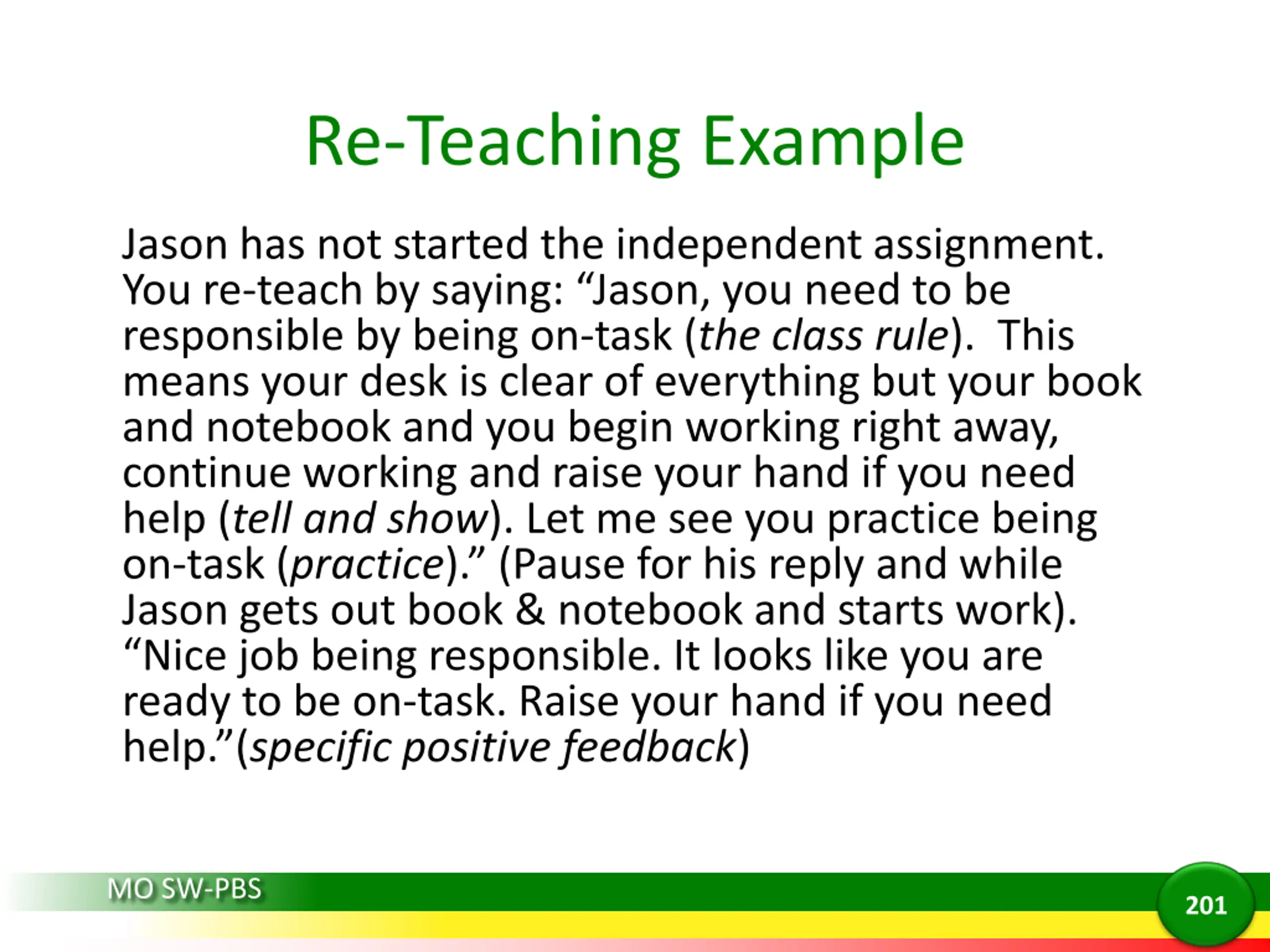Re-Teaching Example Jason has not started the independent assignment. You re-teach by saying: Jason, you need to be responsible by being on-task (the class rule). This means your desk is clear of everything but your book and notebook and you begin working right away, continue working and raise your hand if you need help (tell and show). Let me see you practice being on-task (practice). (Pause for his reply and while Jason gets out book & notebook and starts work). Nice job being responsible. It looks like you are ready to be on-task. Raise your hand if you need help. (specific positive feedback) MO SW-PBS 201